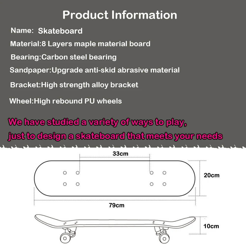 【Duradero y estable】el monopatín de madera de arce de 8 capas de alta densidad proporciona un agarre estable y más potente durante el patinaje. Peso máximo de soporte 150KG, adecuado para adultos y niños. Patrón: la transferencia de calor (que está impresa en el tablero, no es una pegatina) hace que el patrón se mantenga mucho tiempo.