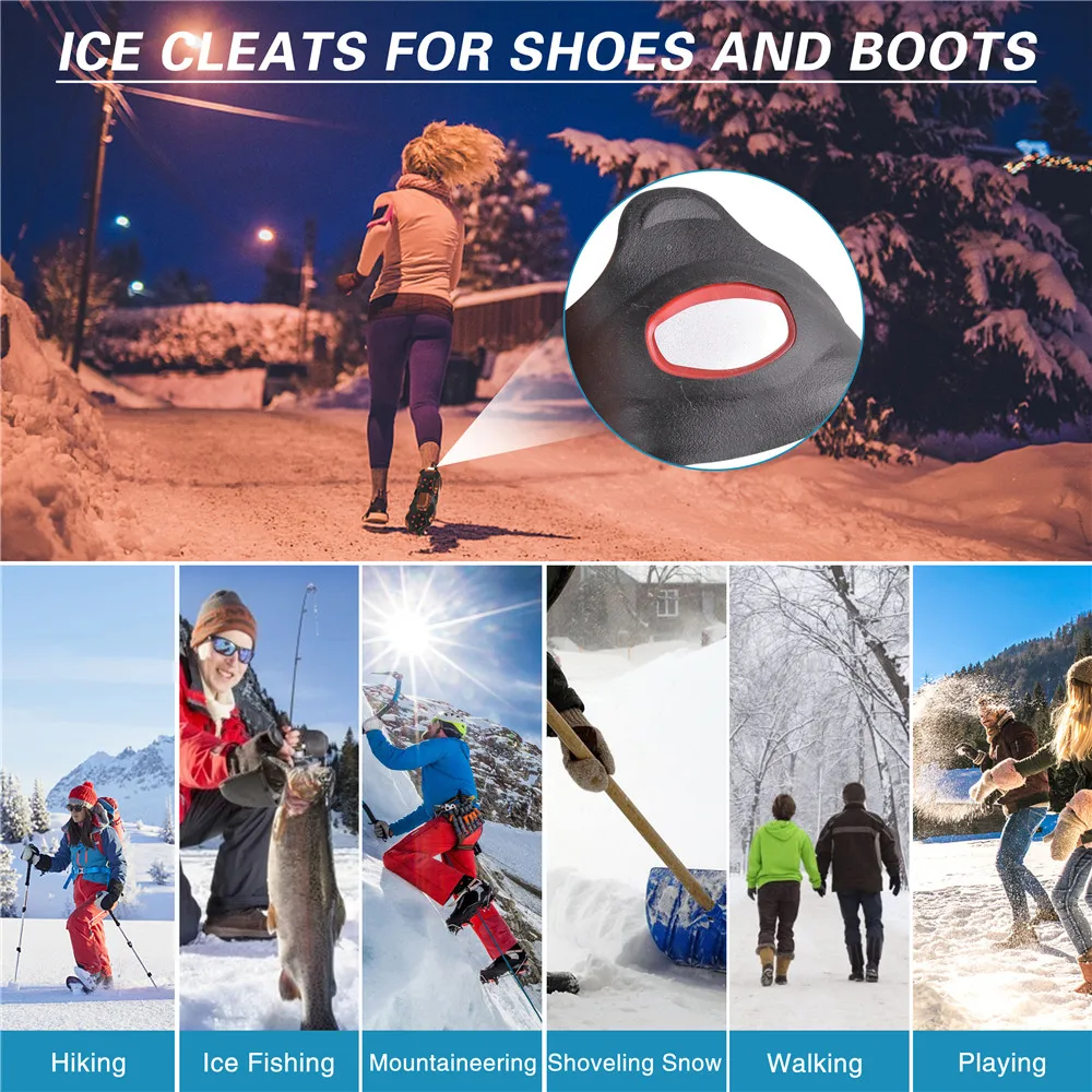 【AMPLIAMENTE UTILIZADO】 Ya sea caminando, escalando, pesca en hielo, caminando, trotando u otras actividades al aire libre, los 10 tacos para nieve en hielo brindan tracción en estabilidad en todas las direcciones.