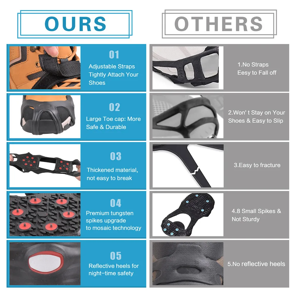 【PANAS DE HIELO ANTIDESLIZANTES】 Los tacos de hielo para zapatos y botas de montaña tienen 10 aceros diseñados de una sola pieza, que son más estables y no se caen fácilmente, brindan una excelente tracción antideslizante al caminar sobre nieve y hielo.