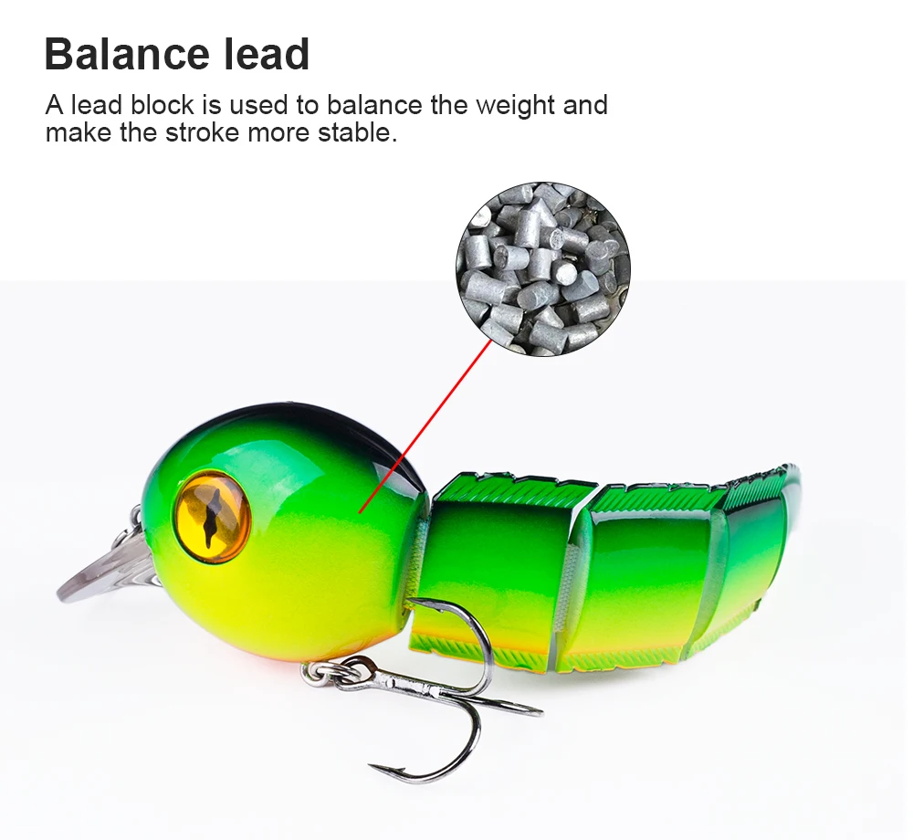 La acción de natación perfecta es mortalmente atractiva para los peces. Este Tipo de señuelo de pesca muestra una acción de natación animada en el agua, con bola de acero en el interior, Los cebos pueden mantenerse estables durante el lanzamiento y pueden aumentar la distancia de lanzamiento al mismo tiempo.