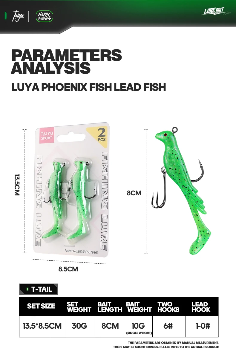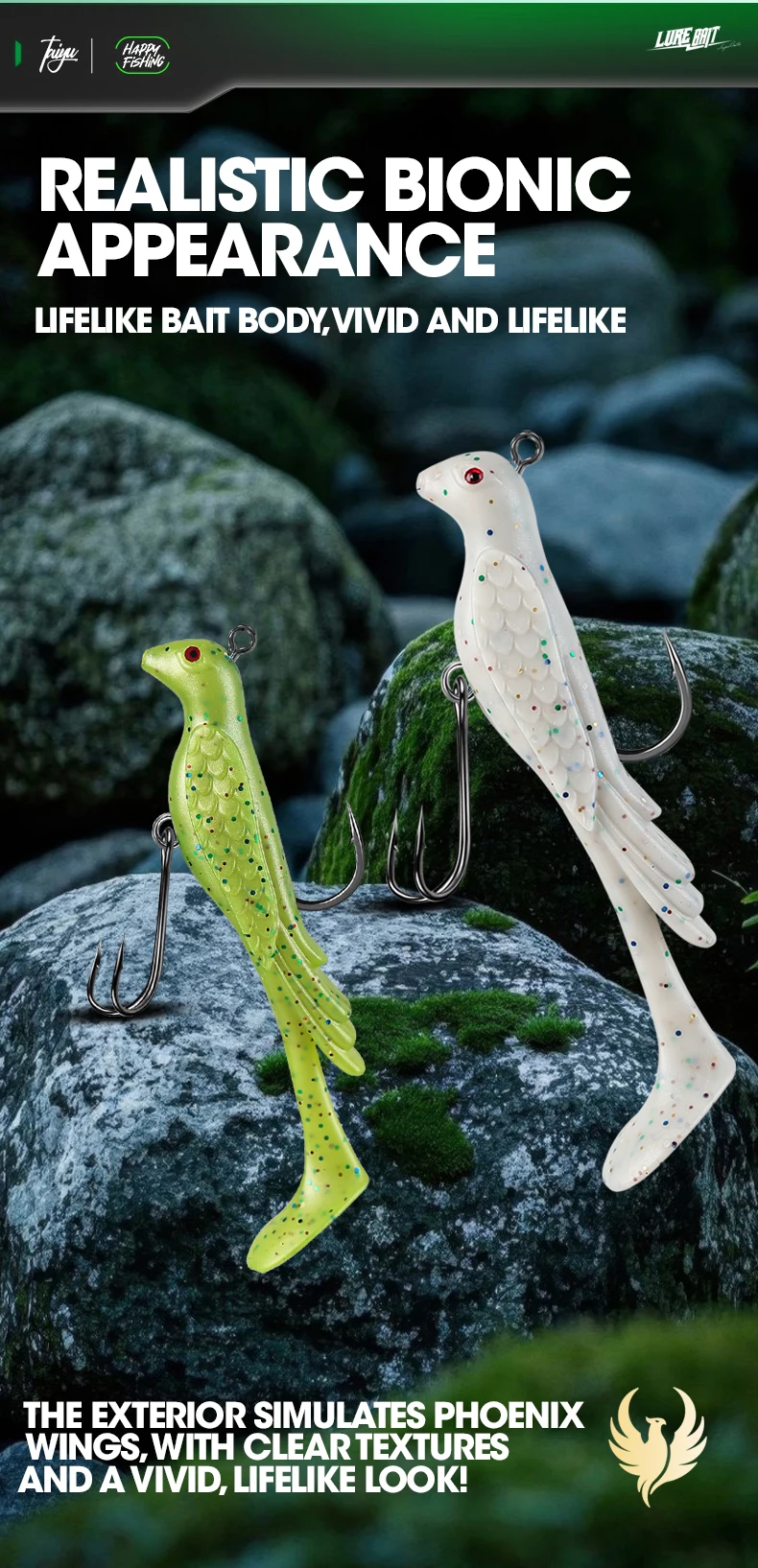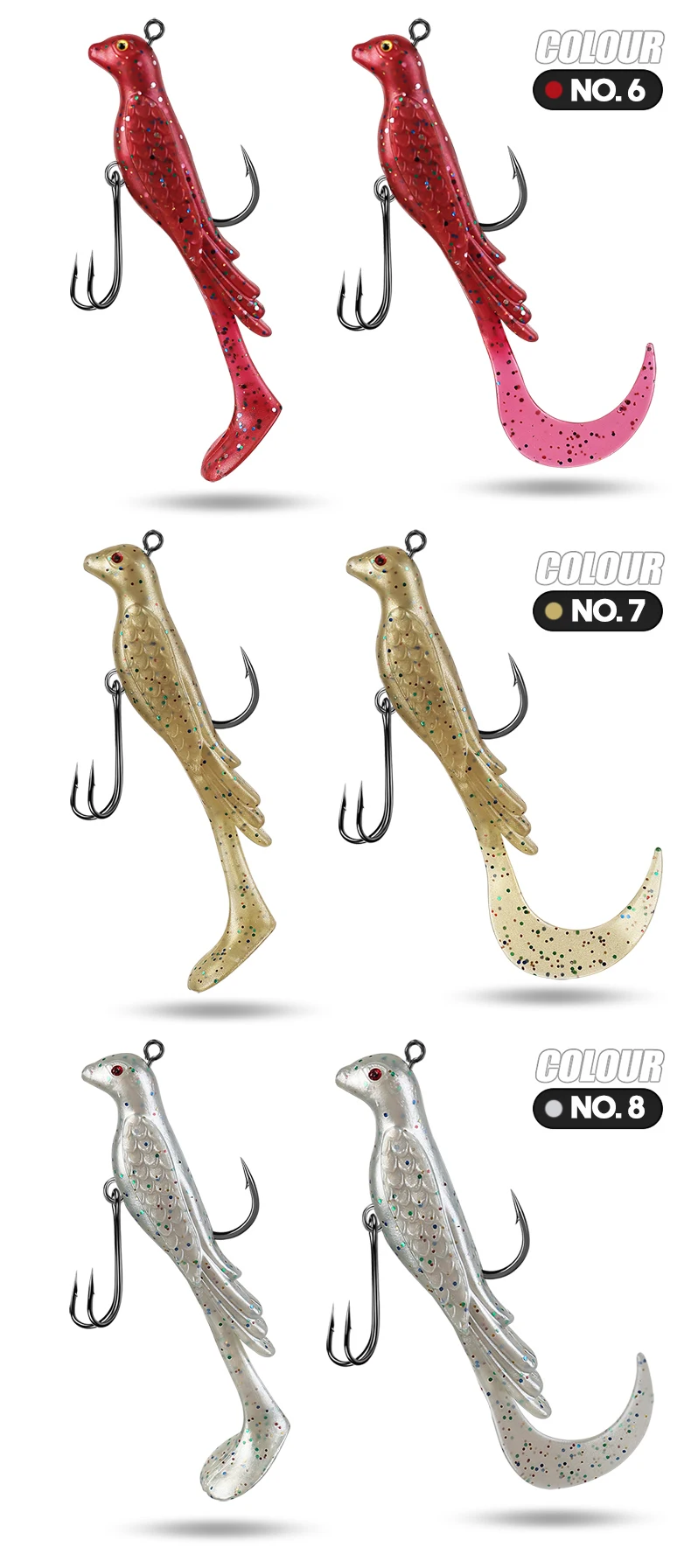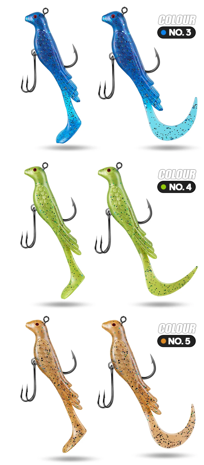 TAIYU 2 uds Phoenix Bird señuelo de pesca suave multicolor ondas grandes enrolladas señuelo de pesca falso para agua salada/cebo de pesca de agua dulce