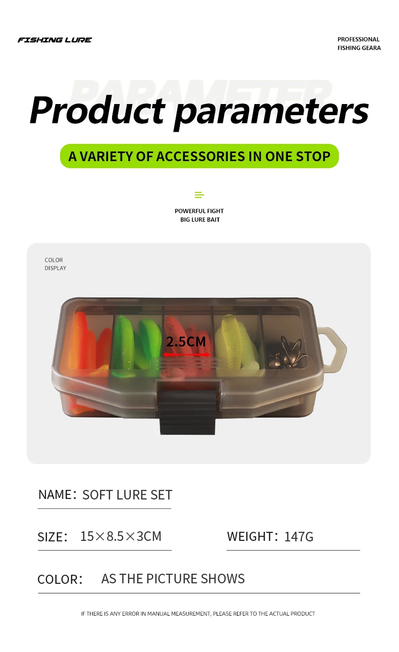 La apariencia del cebo blando producido en cada lote puede ser un poco diferente al de la imagen, lo que no afecta el uso real del producto.