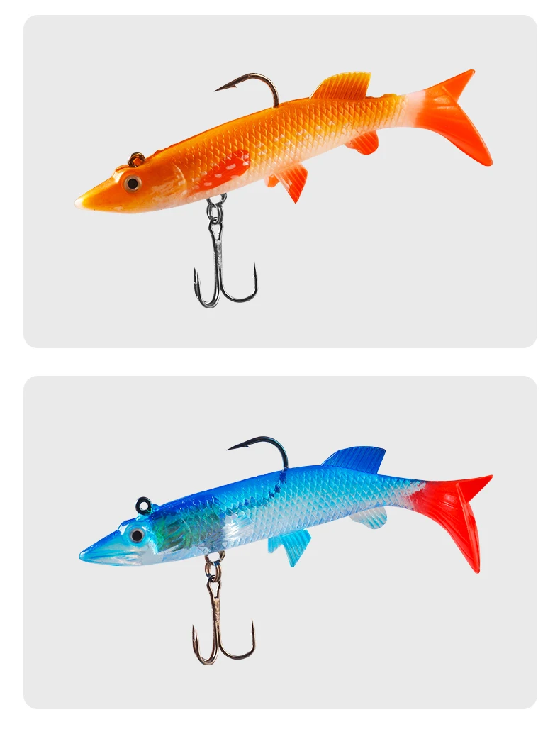 TAIYU-Kit de Señuelos de Pesca blandos, 5 uds., 9cm, 14g, cabeza de plantilla Artificial, señuelo suave de silicona, cebo biónico para pesca de trucha y Lucio con 2 ganchos