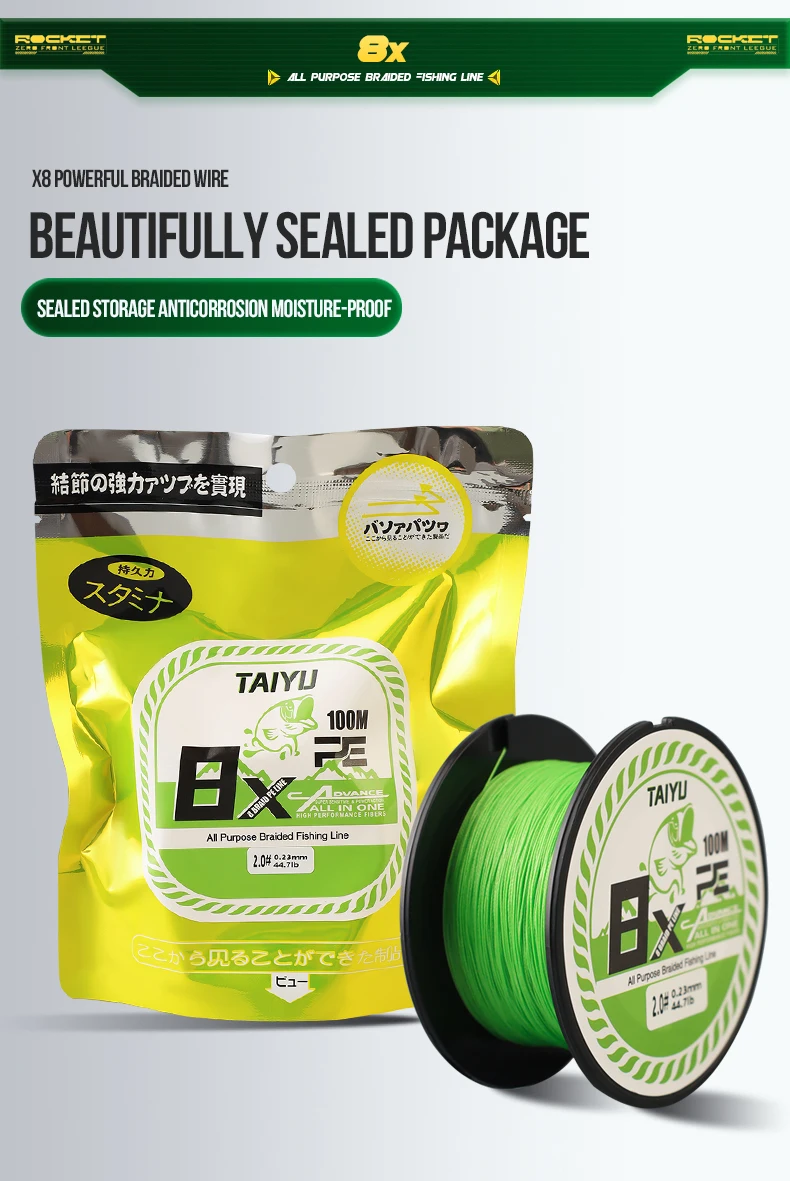 Línea de pesca trenzada TAIYU de 8 hebras, 100M, PE, 32LB-72LB, línea de pesca multifilamento duradera de Japón, línea de pesca de carpa súper suave
