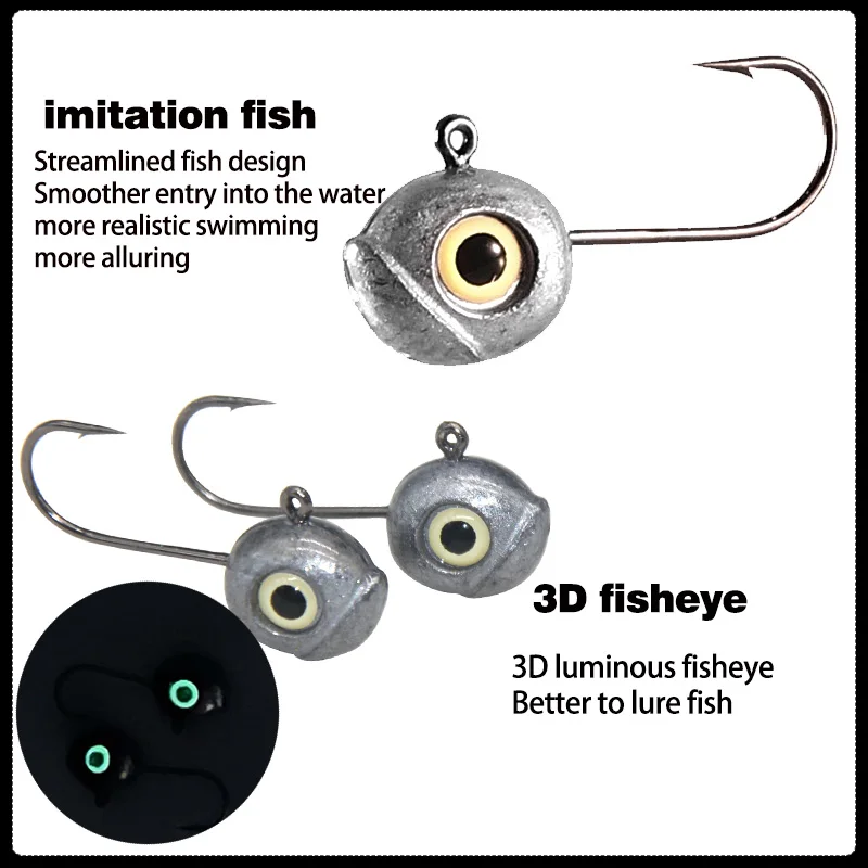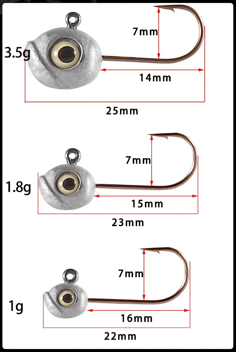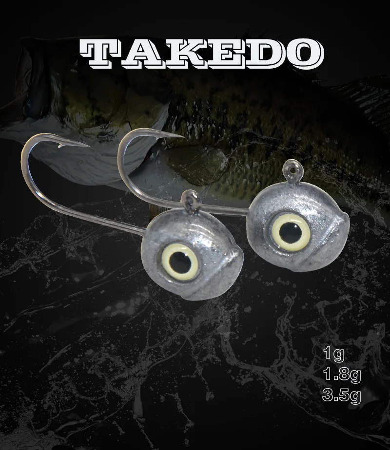 TAKEDO, 10 Uds., anzuelo de hielo con cabeza de anzuelo, 1G, 1,8G, 3,5G, plantilla con cabeza de ojos de pez, microobjetos con cebo suave, ganchos de Metal para lubina, trucha, Lucio