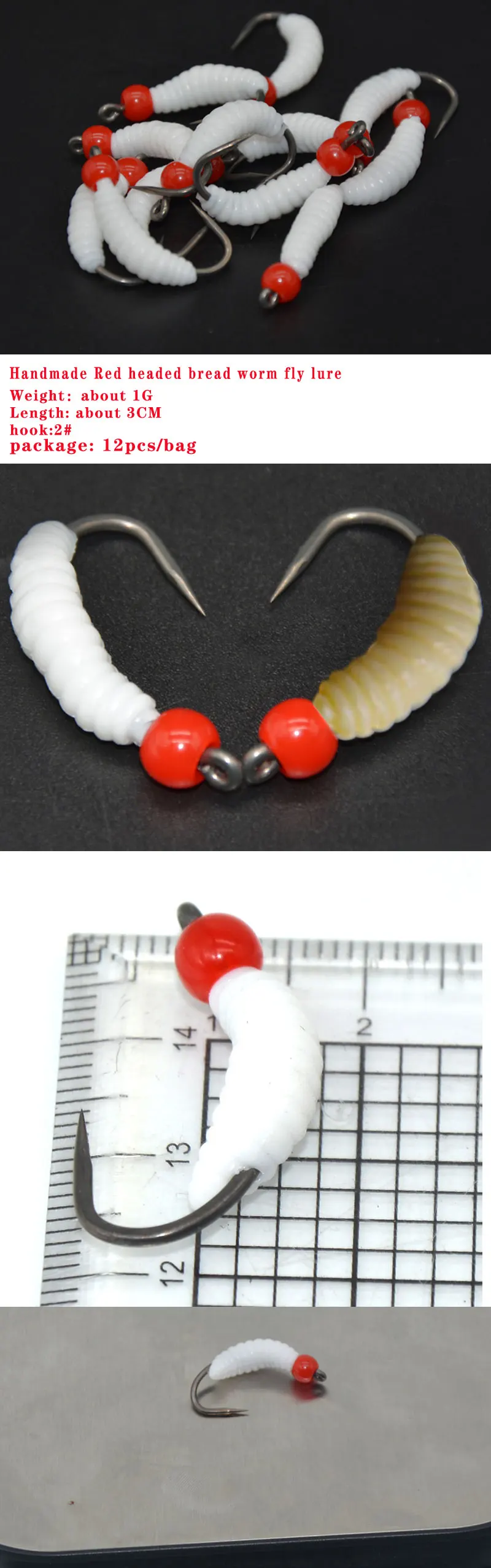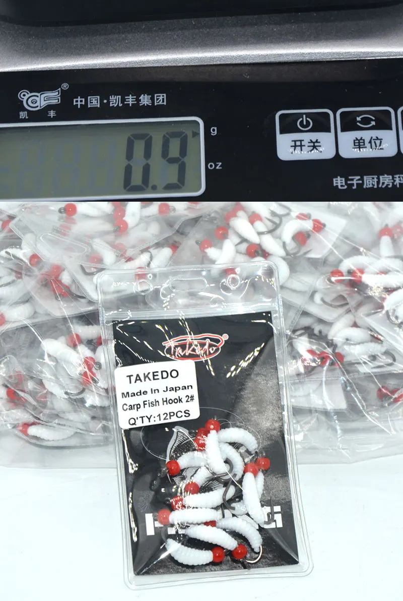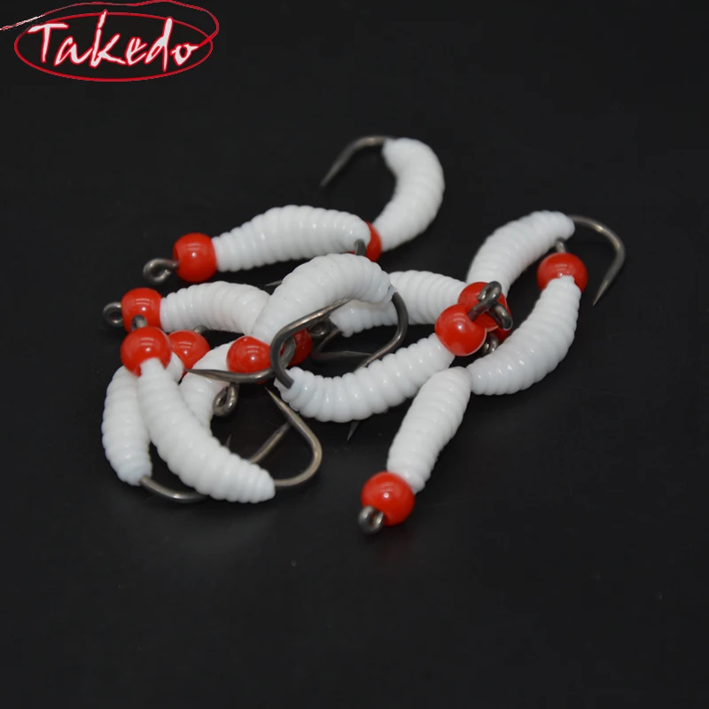 TAKEDO 12 Uds señuelo suave para pesca de carpa cebo larva cebos de señuelo suave olor cabeza roja pan gusano señuelo de pesca con mosca con gancho