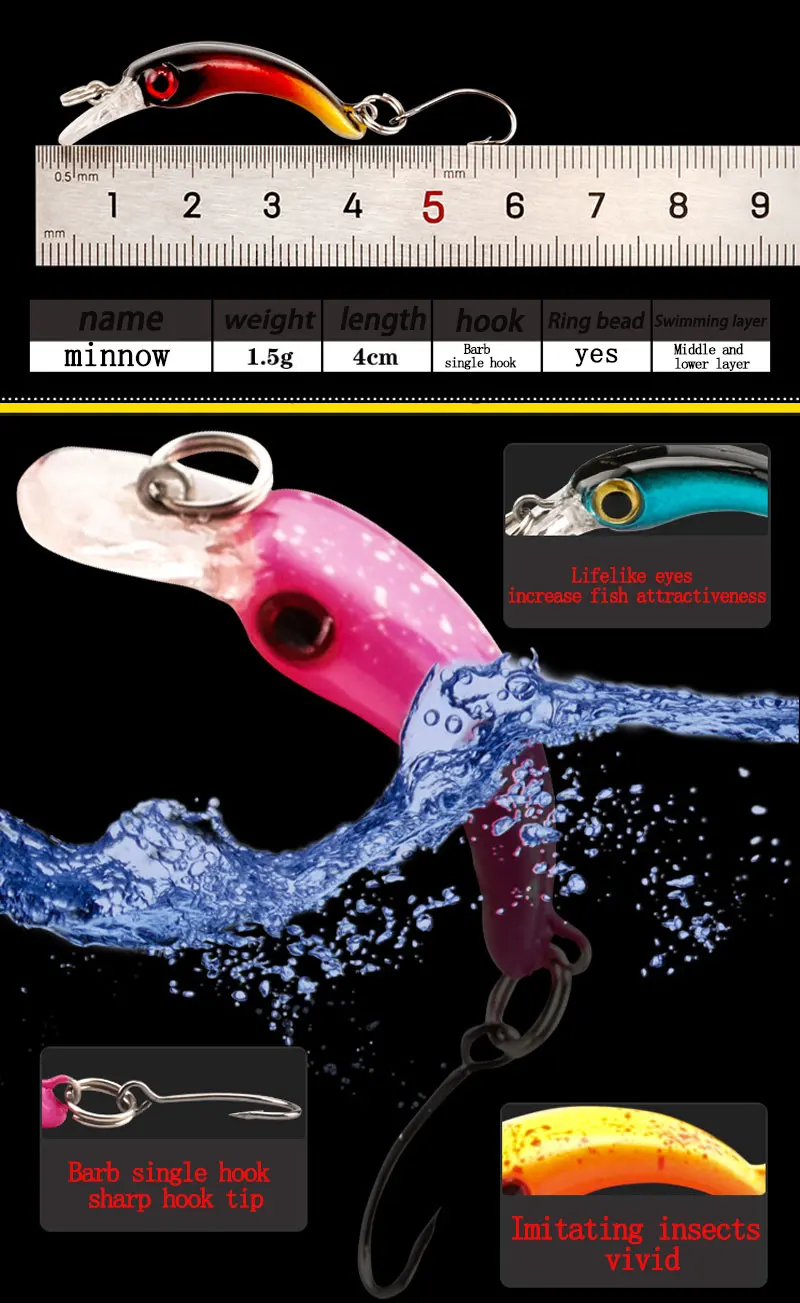 TAKEDO 8 unids/caja 1,5G 4CM señuelo de pesca Minnow cebo carpa Señuelos de Pesca Wobblers Jerkbait flotante Mini señuelo duro