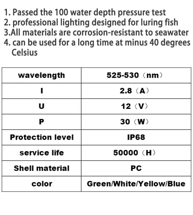 Nombre del productoSeñalar peces corderoTamaño12V 30WColorBlanco, verde, amarillo, azulMaterialPlástico y MetalTipoSeñalar peces corderoAplicaciónAtraer peces