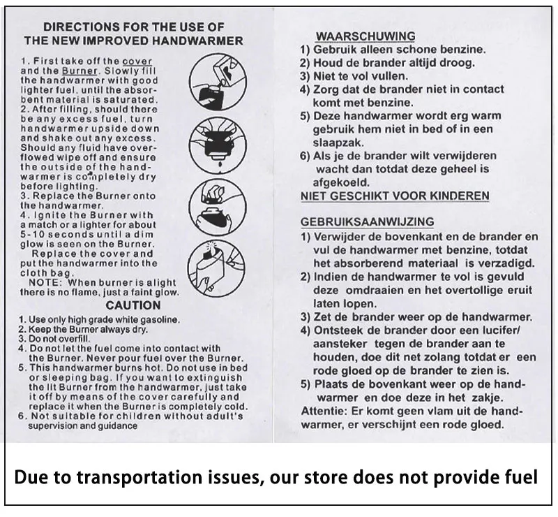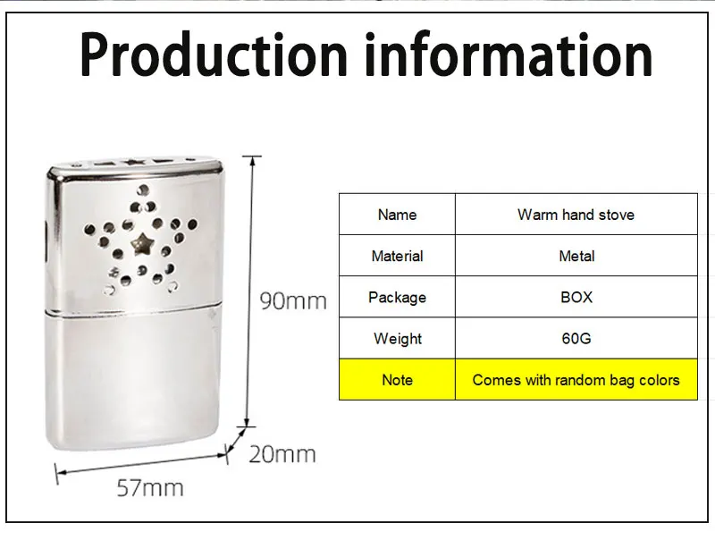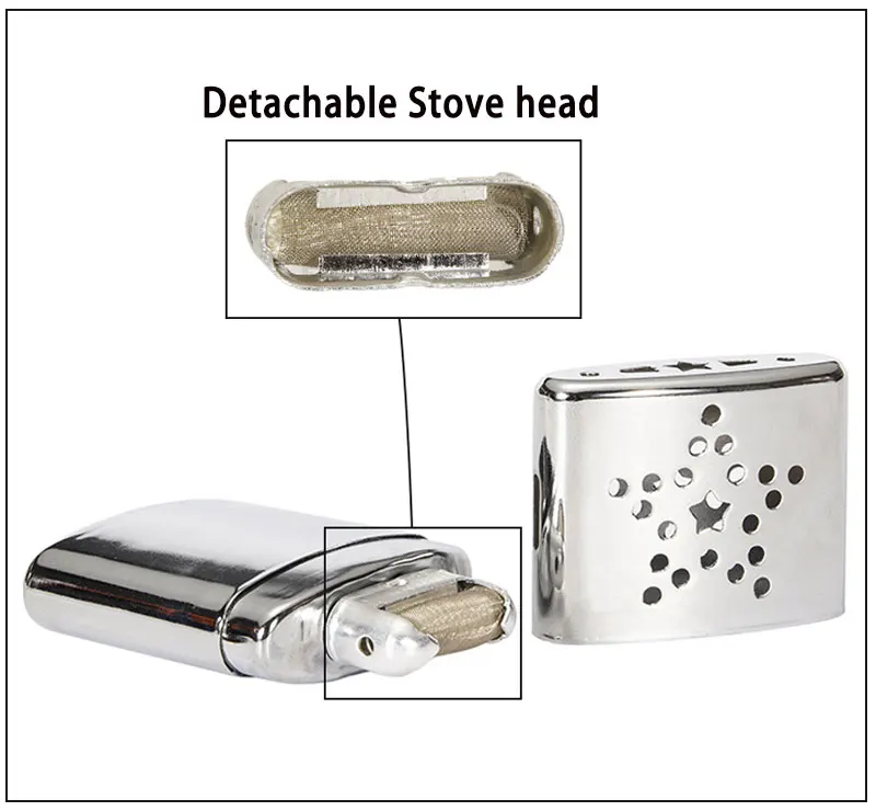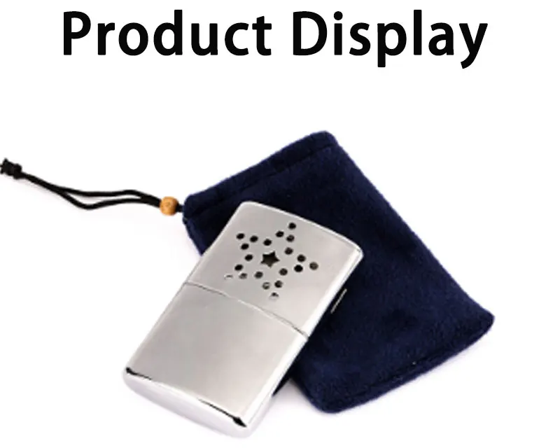 Descripción: Calentador de manos de platino 100% nuevo y de alta calidad Muy económico debido al bajo consumo de combustible. Quemaduras limpias debido a la catálisis de platino. La alta producción de calor lo hace utilizable incluso en lugares extremadamente fríos con temperaturas de-40 °C. El diseño de larga duración proporciona muchos años de servicio. Calentador de manos de bolsillo de acero inoxidable, calentadores portátiles pequeños y ultraligeros, calentadores disponibles para interiores y exteriores Fácil de encender y perfectamente seguro mientras está en uso. Solo funciona con una cerilla o un encendedor. Funciona solo por catálisis producto un calor radiante sin llama, seguro y limpio. Más adecuado para protección contra el frío, tratamiento médico, esquí, montaña, escalada, camping y caza. Se puede utilizar como regalo de Navidad, regalo de Año Nuevo, para regalar a amigos o familiares.