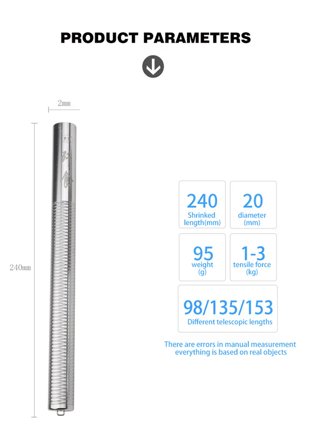 Diámetro: 2cm (fácil de sostener con una mano)Peso: el peso de un solo polo es de solo 95g (el aluminio espacial es duro y ligero), las ruedas son de 170g, un juego de 270gTamaño del paquete individual: 27*15*6cmLongitud de estiramiento: 1m/1,4 M/1,6 M opcionalEmbalaje: Tarjeta BlísterConfiguración del producto: 1. Varilla * 1Imágenes detalladas
