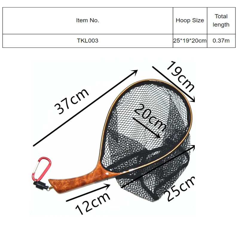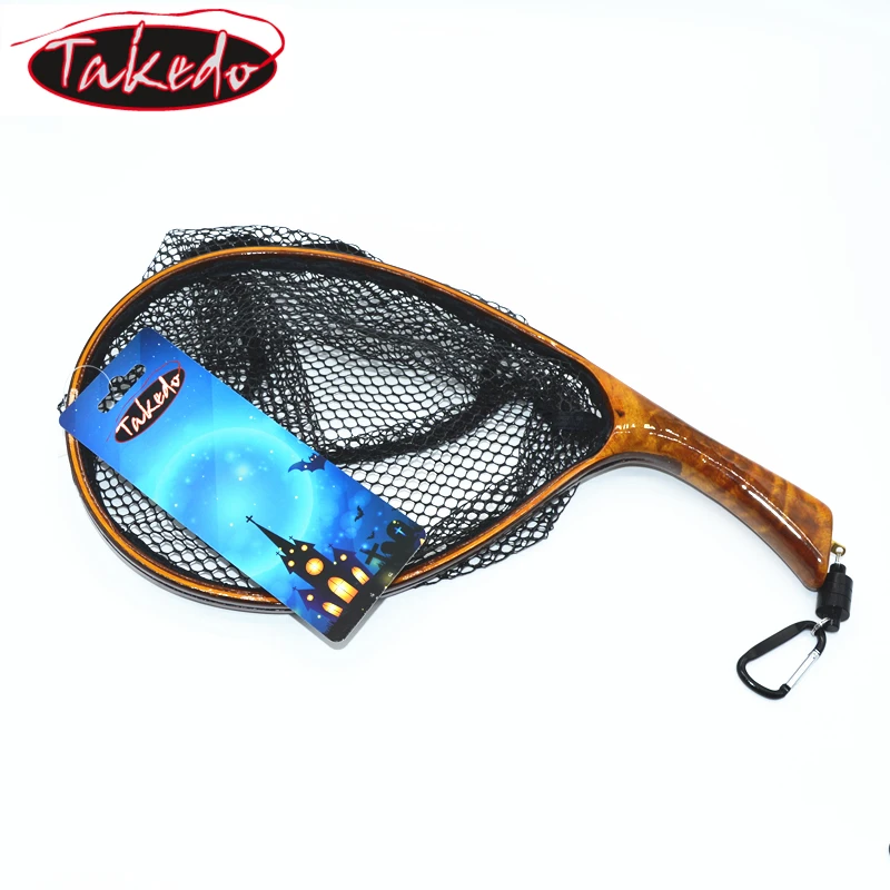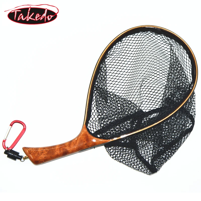 TAKEDO-Red de aterrizaje de pesca con mosca, Red de trucha de malla de goma suave, Cinnamomum Camphora, Red de captura y liberación con mango de madera, TKL003