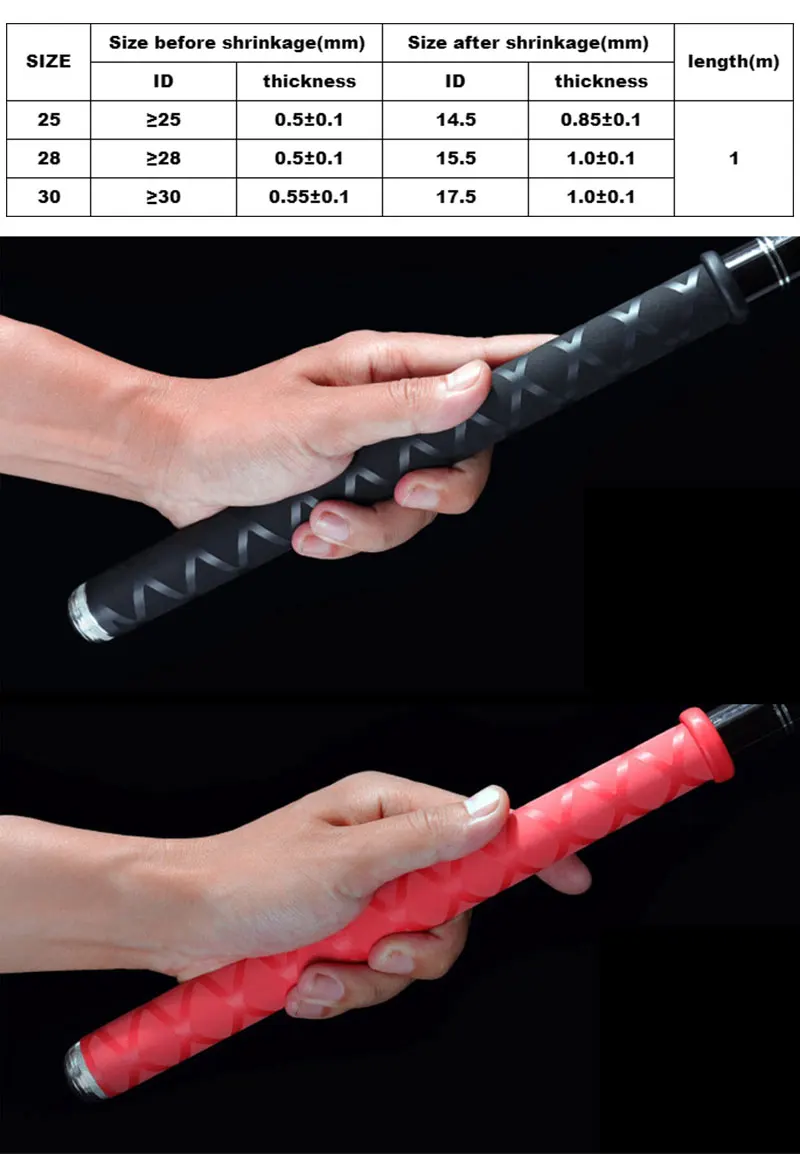 Ámbito de aplicación: Se utiliza principalmente en artes de pesca, equipos deportivos o equipos de fitness, antideslizante, hermoso, etc.TAMAÑO Tamaño antes de la contracción (mm) Tamaño después de la contracción (mm) longitud (m) ID espesor ID espesor 25 ≥25 0.5±0.1 14.5 0.85±0.1 1 28 ≥28 0.5±0.1 15.5 1.0±0.1 30 ≥30 0.55±0.1 17.5 1.0±0.1