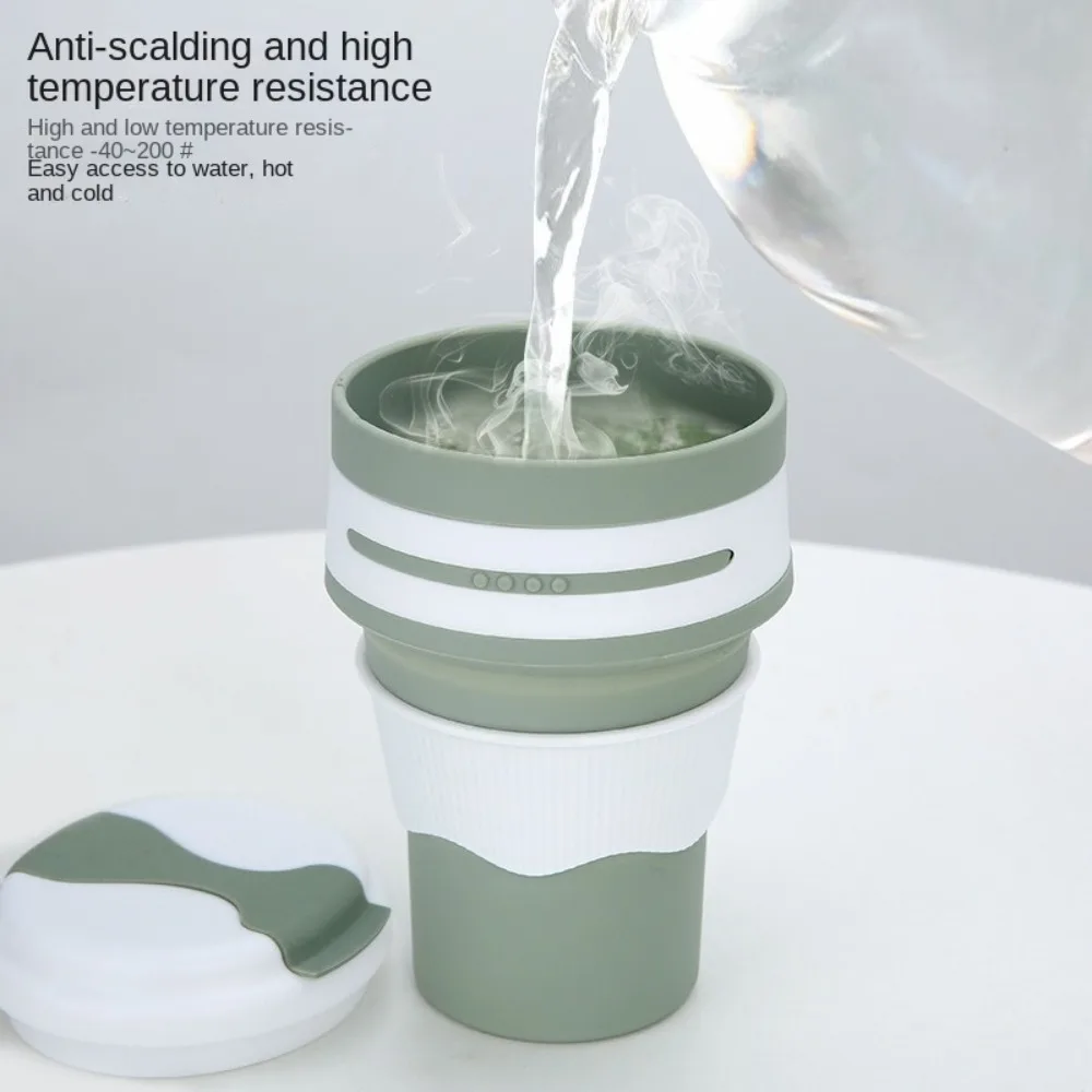 When you expand it, it can hold 300-350ml of water, and our designer specially designed anti-hot handle and leak-proof cover.