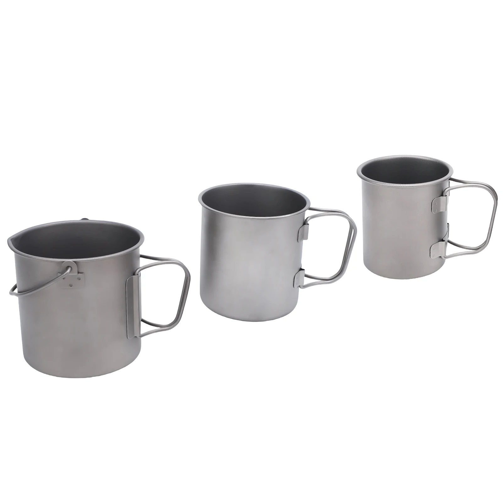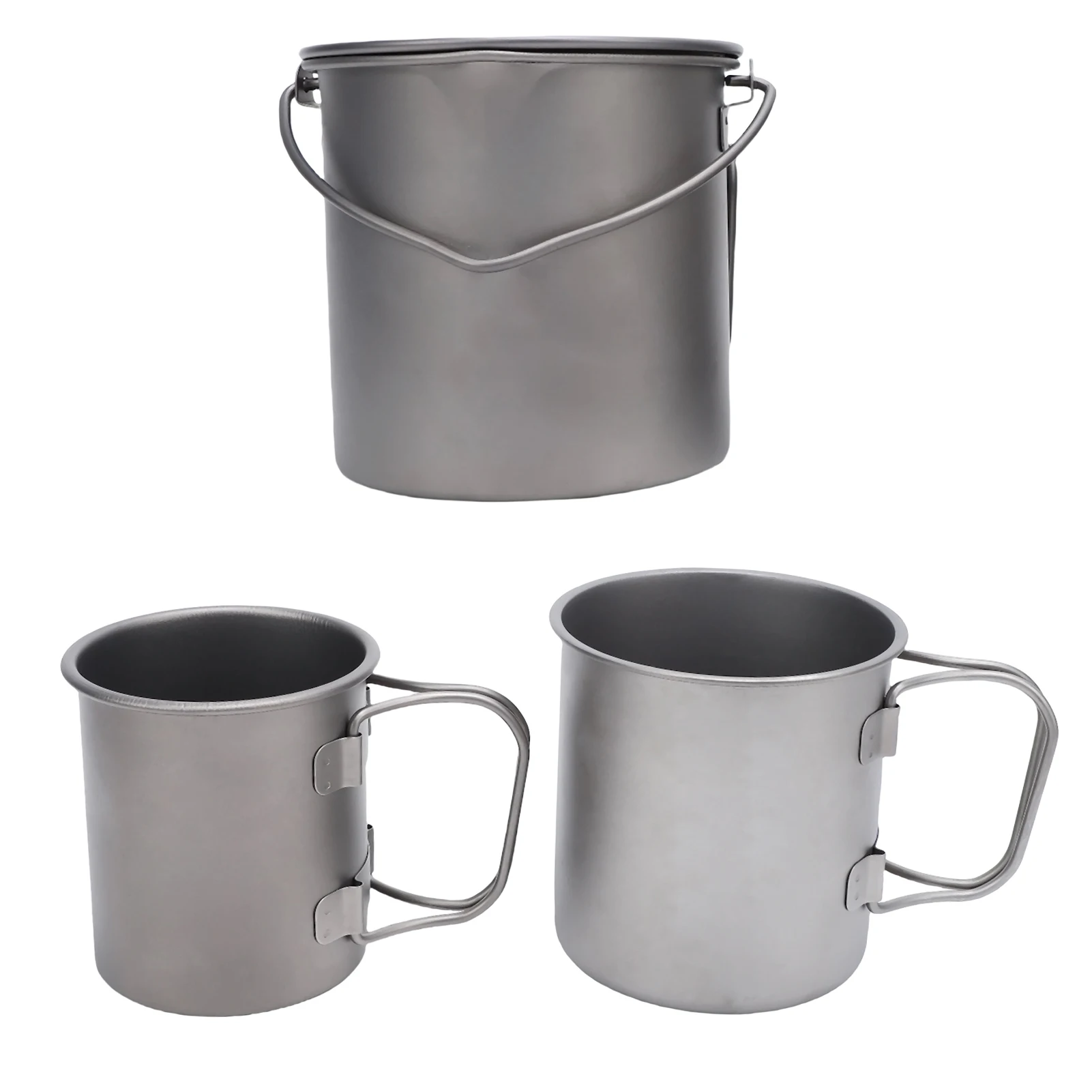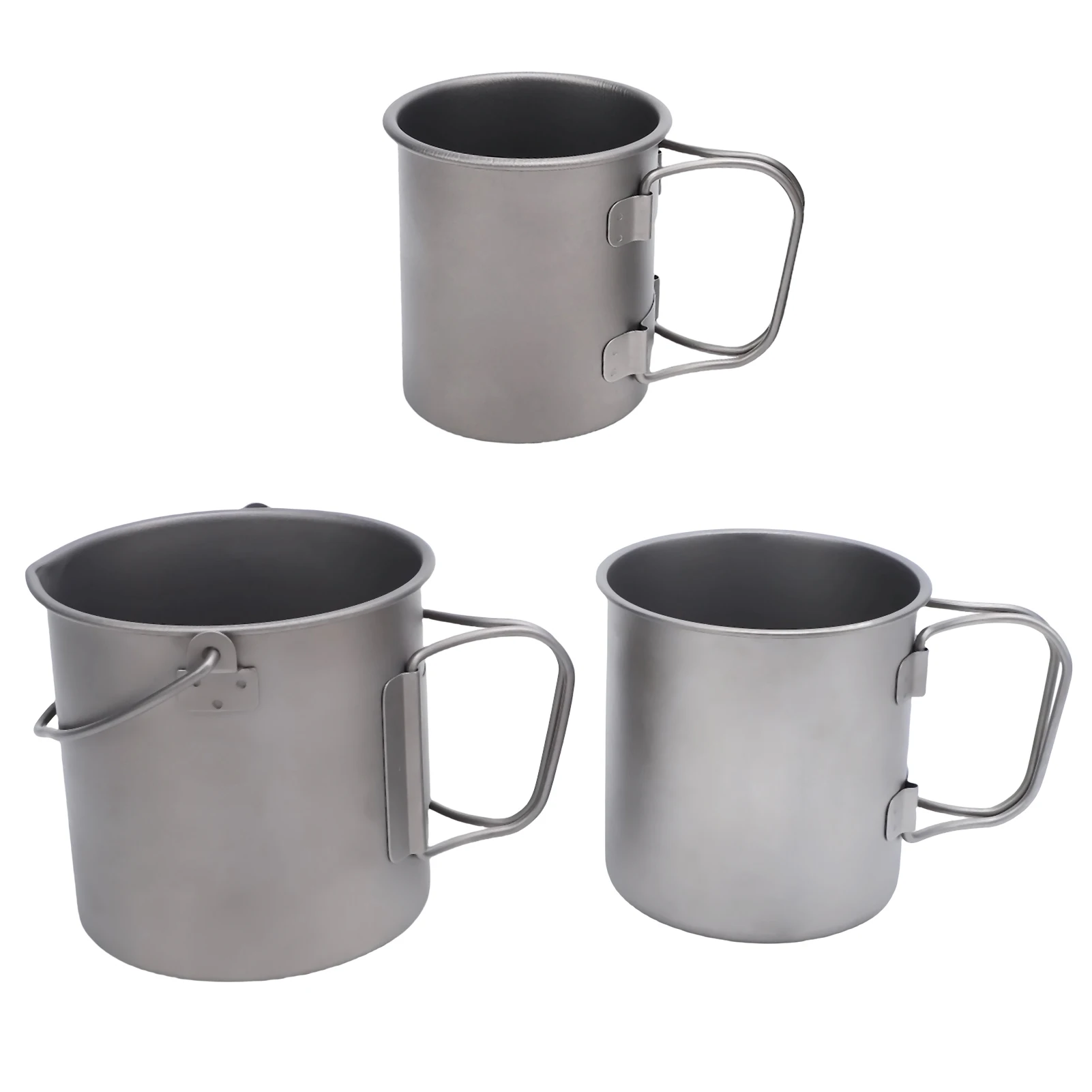 1.Juego de tazas de camping Ti portátiles: tres tazas de camping con tapas, asas plegables y bolsas de malla, convenientes para actividades al aire libre.