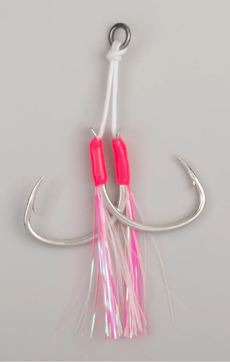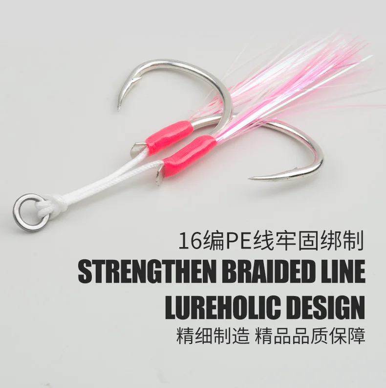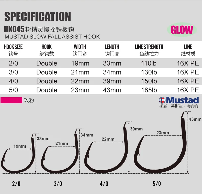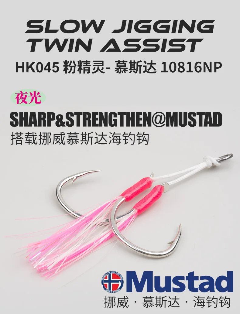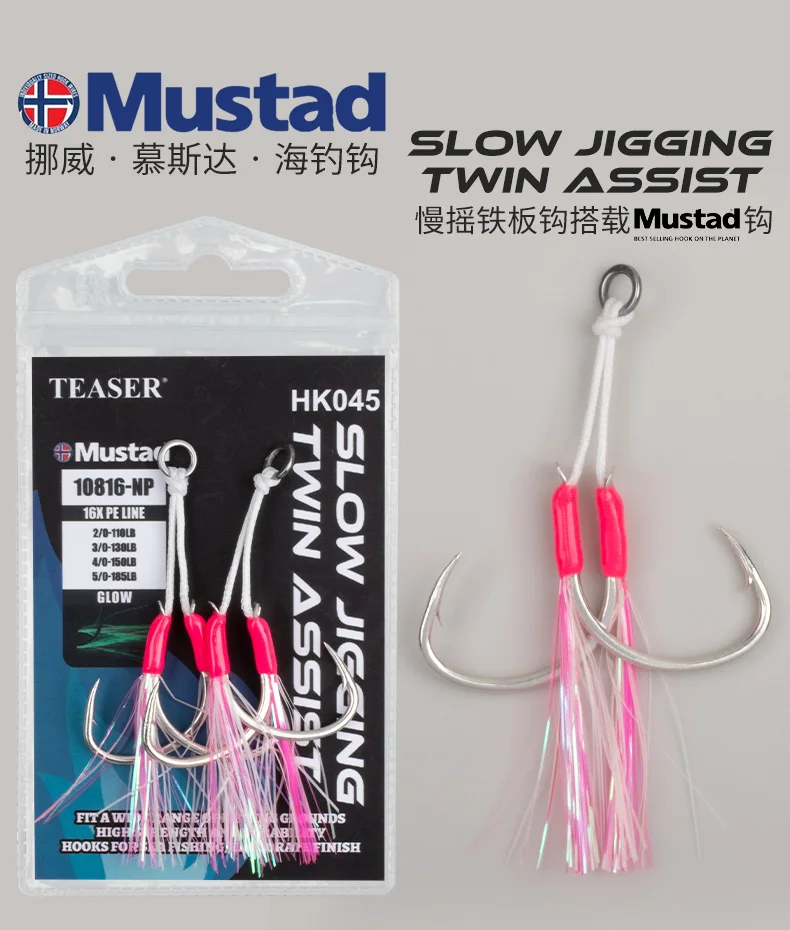 TEASER HK045 2, 2/0, 3/0, 4/0, 5/0, Mustad, anzuelo de asistencia para Jigging de caída lenta, anzuelos de Metal de pesca de acero de alto carbono luminosos rosas
