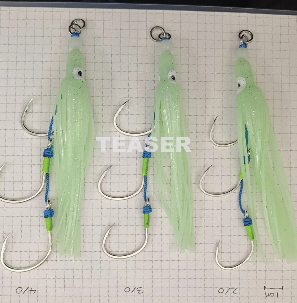 5.Este cebo auxiliar también tiene un teaser de calamar en la parte superior para ayudar aún más a un deslizamiento más aerodinámico hacia el fondo.
