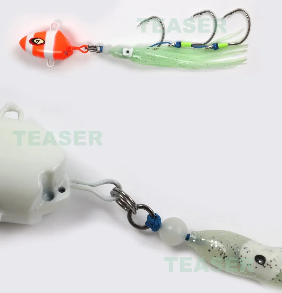 5.Este cebo auxiliar también tiene un teaser de calamar en la parte superior para ayudar aún más a un deslizamiento más aerodinámico hacia el fondo.