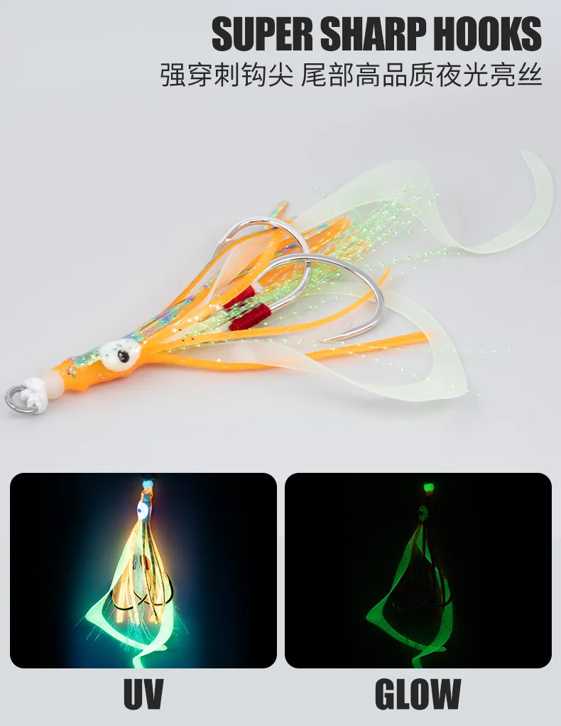 TEASER HK018 2 unids/bolsa gancho de asistencia brillante con falda de calamar Lumious Slow Jigbait falda de silicona anzuelo de pesca accesorios de pesca de mar