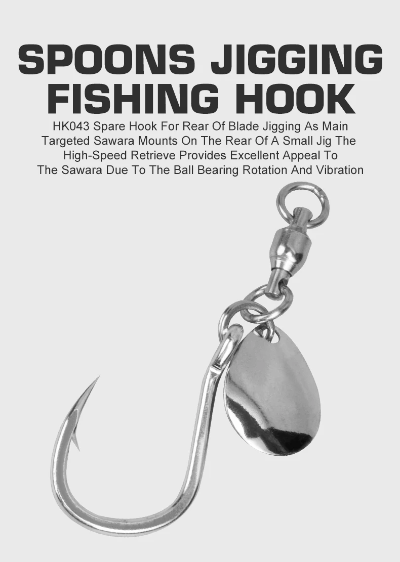 HK043 Gancho de repuesto para la parte trasera de la hoja jigging como objetivo principal. Sawara se monta en la parte trasera de una plantilla pequeña. La recuperación de Alta Velocidad proporciona un excelente atractivo al sawara debido a la rotación y vibración del rodamiento de bolas.