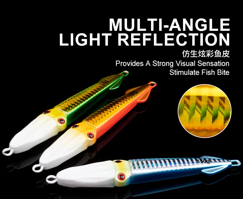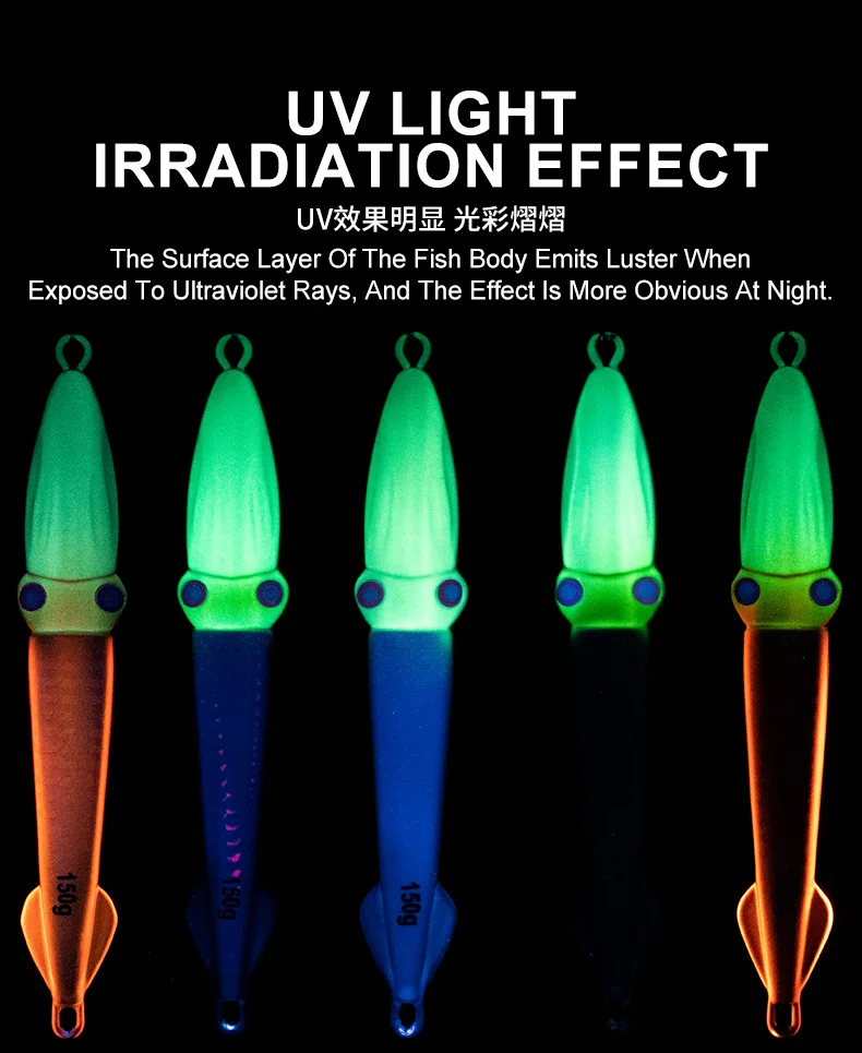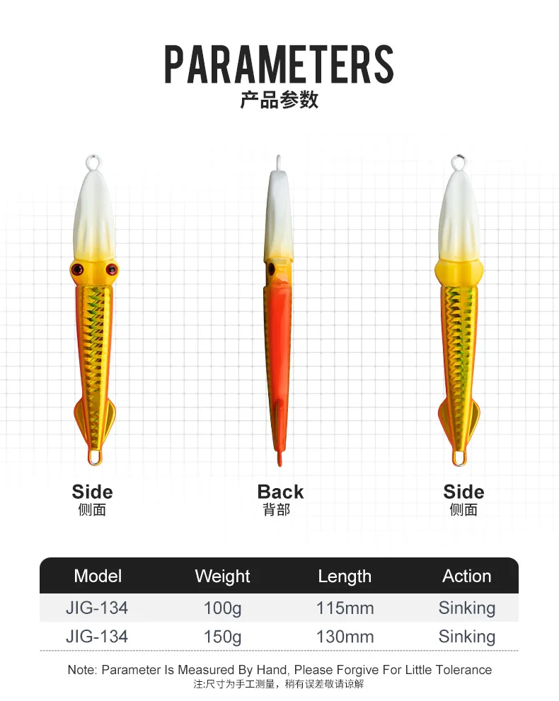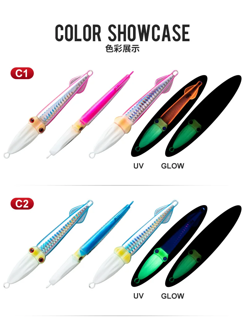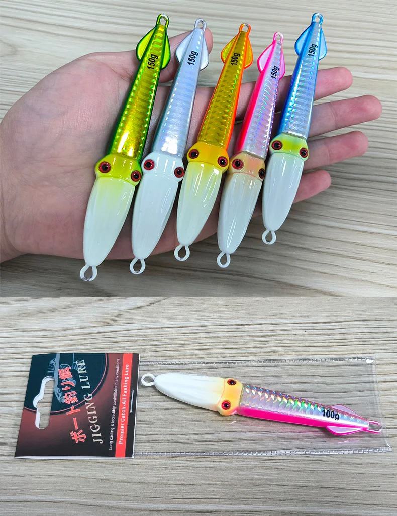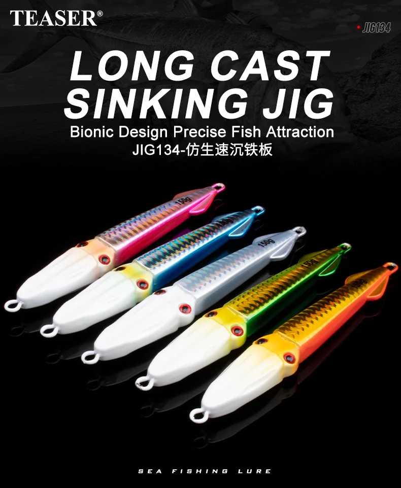 TEASER J134 100g 150g barco pesca cohete calamar biomimético Jigging cebo luz nocturna pesca en el mar hundimiento rápido señuelo de plantilla de Metal duro