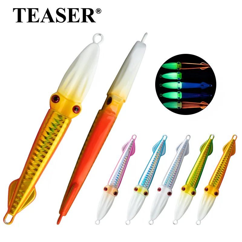 TEASER J134 100g 150g barco pesca cohete calamar biomimético Jigging cebo luz nocturna pesca en el mar hundimiento rápido señuelo de plantilla de Metal duro