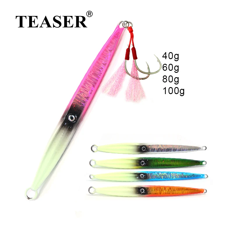 TEASER 40g 60g 80g 100g Kit de señuelo de caída de hundimiento rápido Jig cebo de Metal duro Artificial luminoso aparejos de peces de mar profundo con ganchos de asistencia