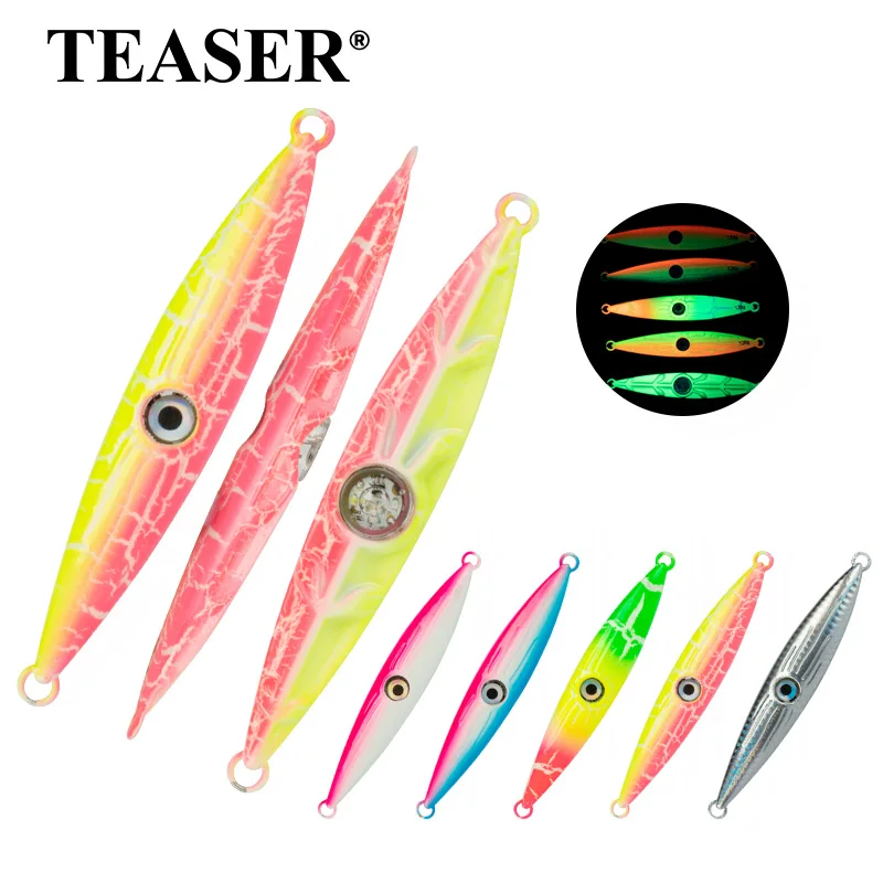 TEASER J111 UV Glow Metal Jig señuelo de pesca Jigging Luz de pesca incorporada lámpara de ojo de pez Metal duro Jigbait 120g 150g 200g 250g