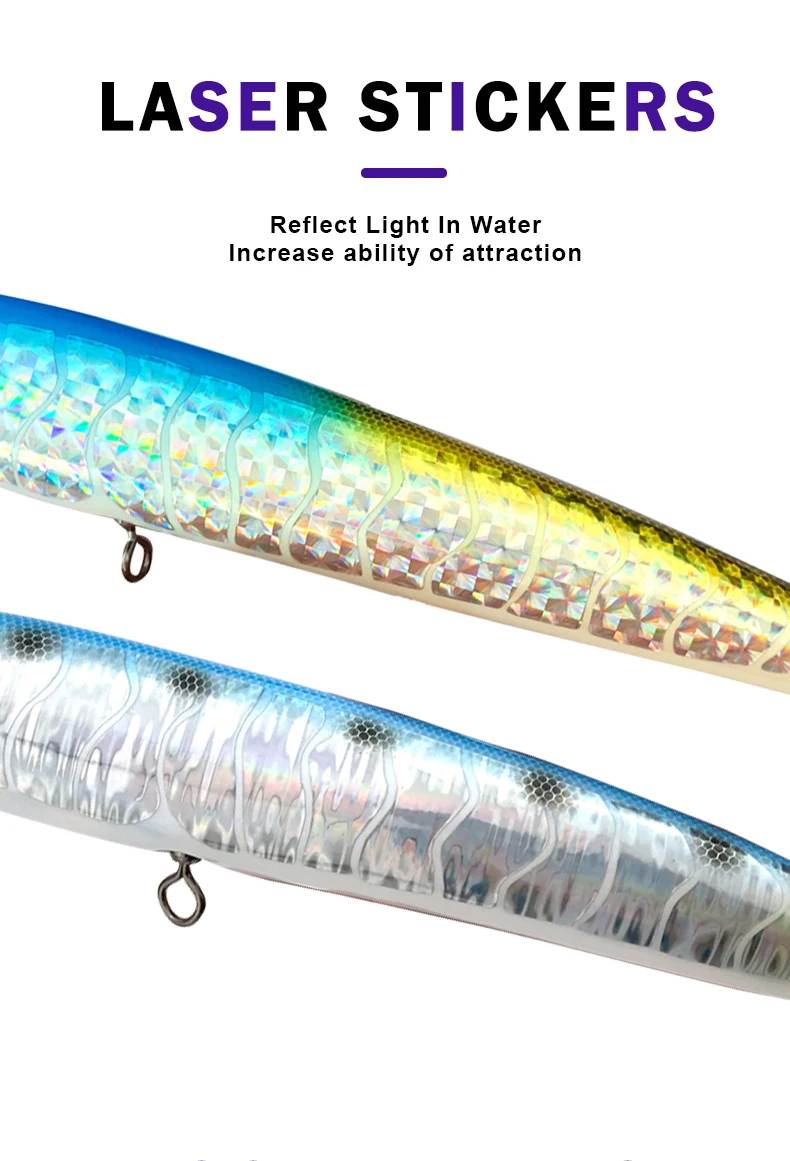 Patrón del cuerpo: utiliza acabados de alta calidad y lámina de estampado en caliente para crear flash y colores para atraer peces depredadores.