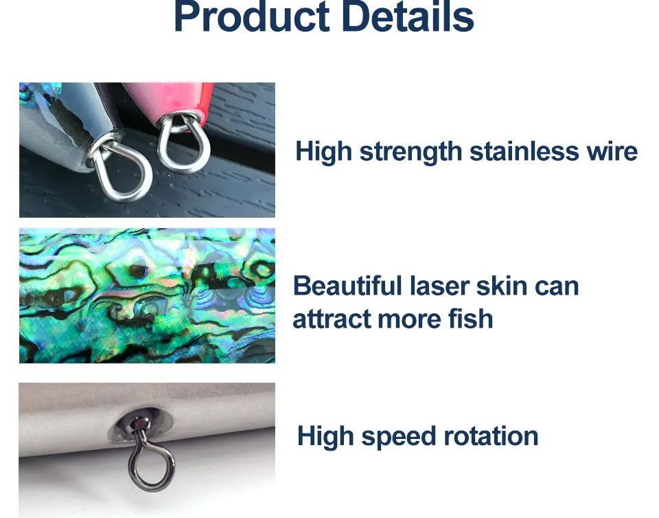 Patrón del cuerpo: uso de acabados de pintura de alta calidad y láminas de estampado en caliente para crear destellos y colores para atraer peces depredadores.