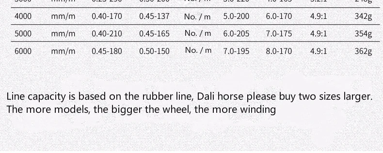 5. de la línea Capacidad: (La capacidad de la línea es adecuada para la línea de goma, Dyneema compre dos tamaños más grandes.