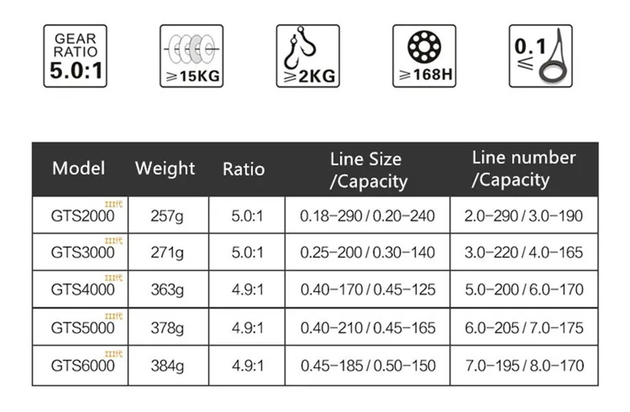 GTS III5000 | Peso: 378g | relación:4,9: 1| Arrastre máximo: 20 kg | Capacidad de Línea: 0,40mm/210 m 0,45mm/165 m