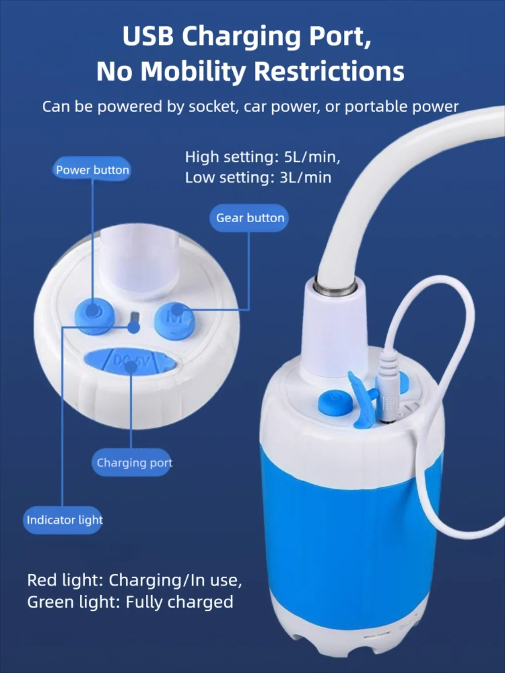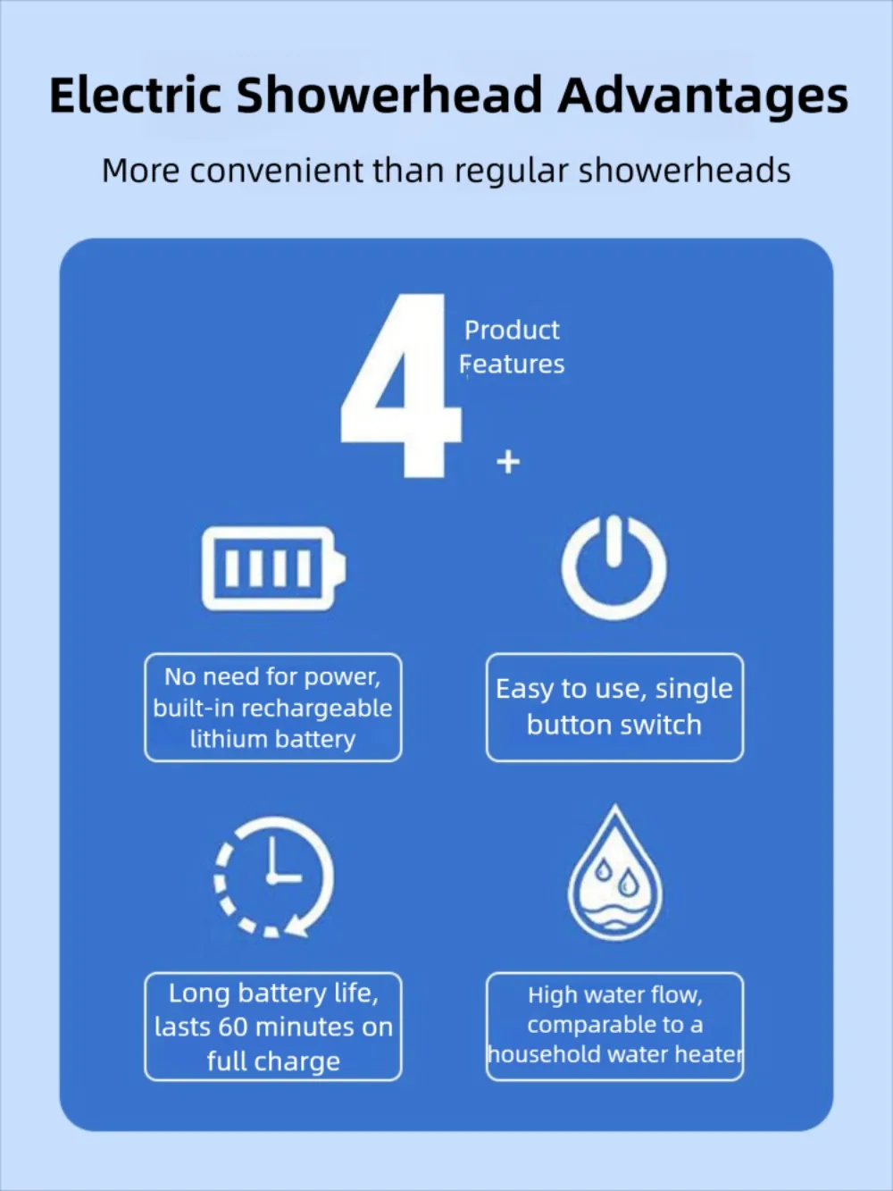 - Bomba de agua recargable: Equipada con una potente bomba recargable, proporciona un flujo de agua constante, lo que permite una experiencia de ducha cómoda sin la necesidad de una fuente de agua constante.