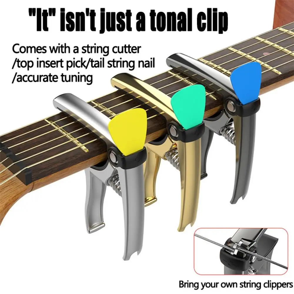 Package includes:1pcs Guitar tuning clip Suitable for Different Guitars: With the adjustable spring tension, our capo for guitar and ukulele is designed to be compatible with your different types of string instruments like electric guitar, classical guitar, folk guitar and ukulele.