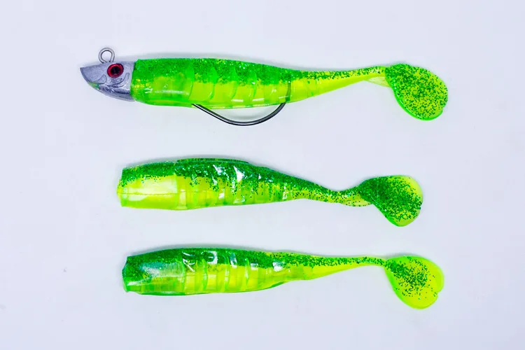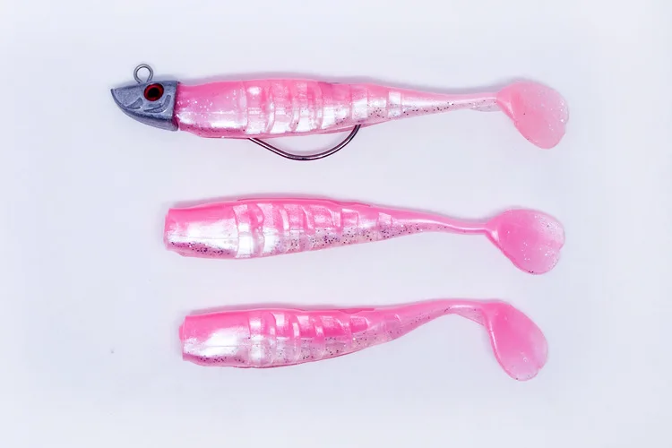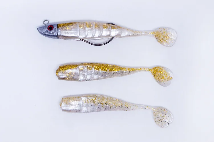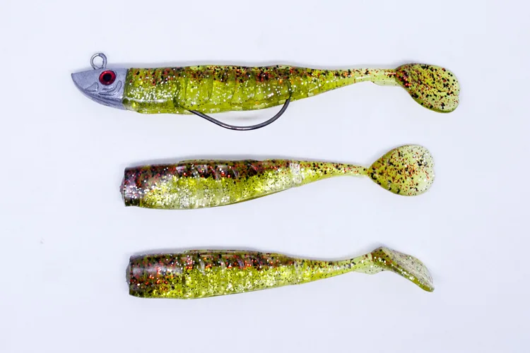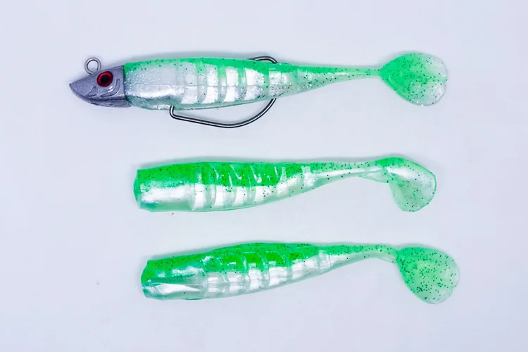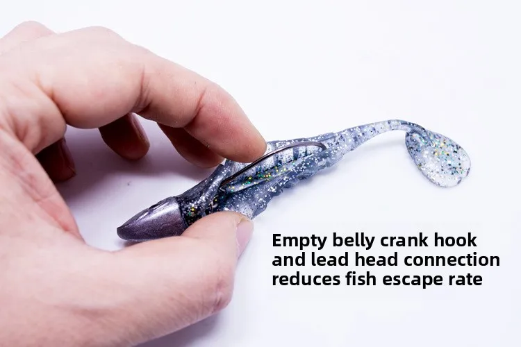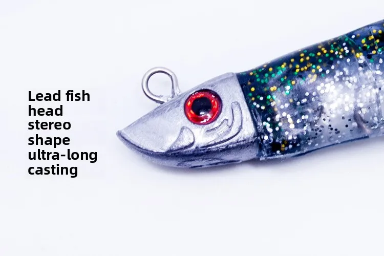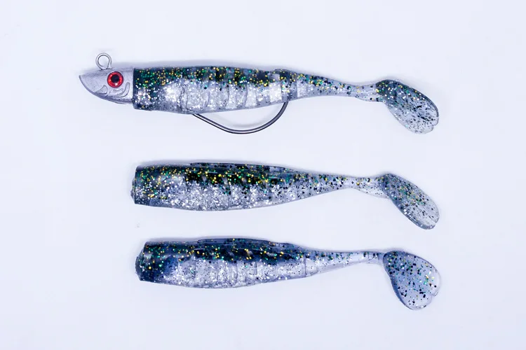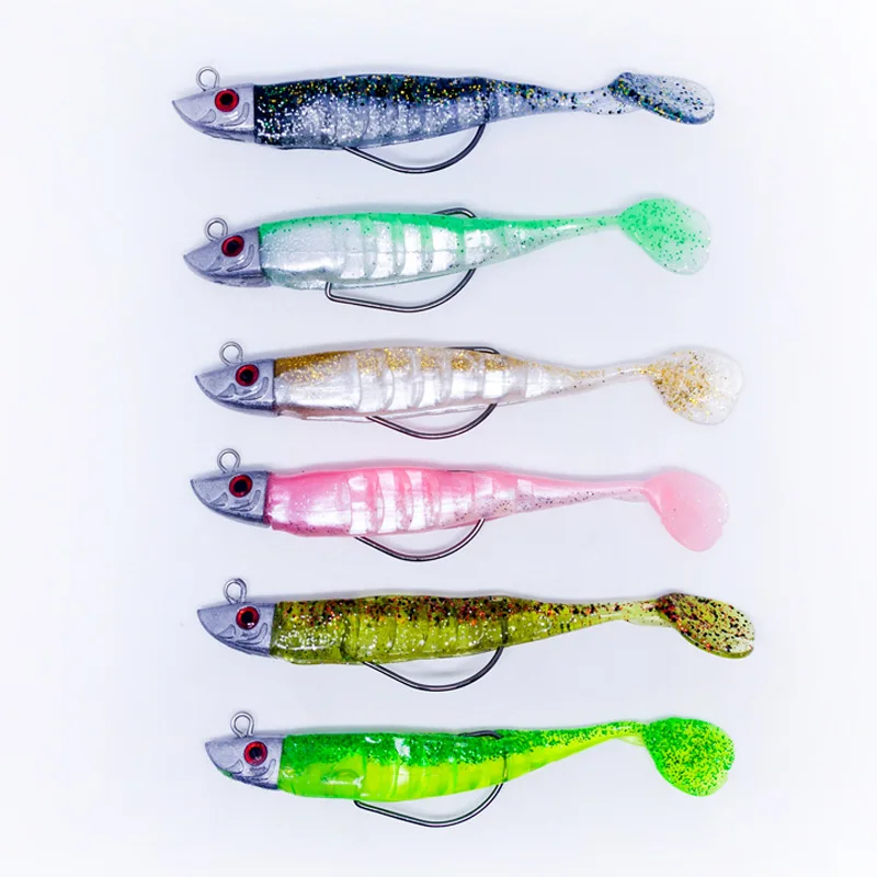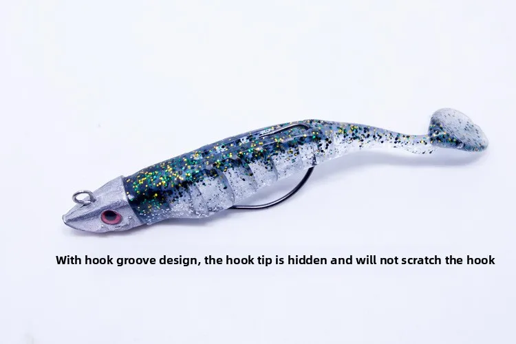 Descripción de la configuración: Jighead en forma de pez + Anillos dobles + Gancho desplazado + Cola en T hueca + 2 piezas (con intermitentes de colores incorporados)