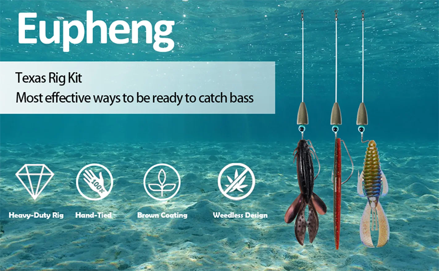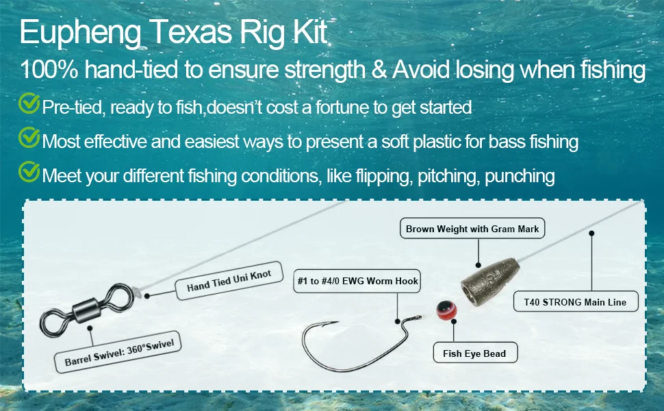 Aparejos Texas prefabricados de Eupheng, 100% atados a mano por técnicos profesionales que usan la línea T40 STRONG, pesos de bala Premium, giratorio, Cuenta de ojo de pez, gancho de compensación afilado y potente. Lo suficientemente fuerte como para ayudarte a atrapar los grandes.