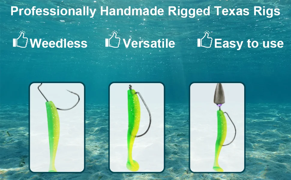 El equipo Texas preatado es la técnica ideal si eres nuevo en la pesca o simplemente no puedes atar tu propio equipo. Están diseñados para cortar la hierba y presentar nuestros cebos a la lubina escondidos en la hierba. Ahorra mucho tiempo, experimenta la diversión de pescar rápidamente.