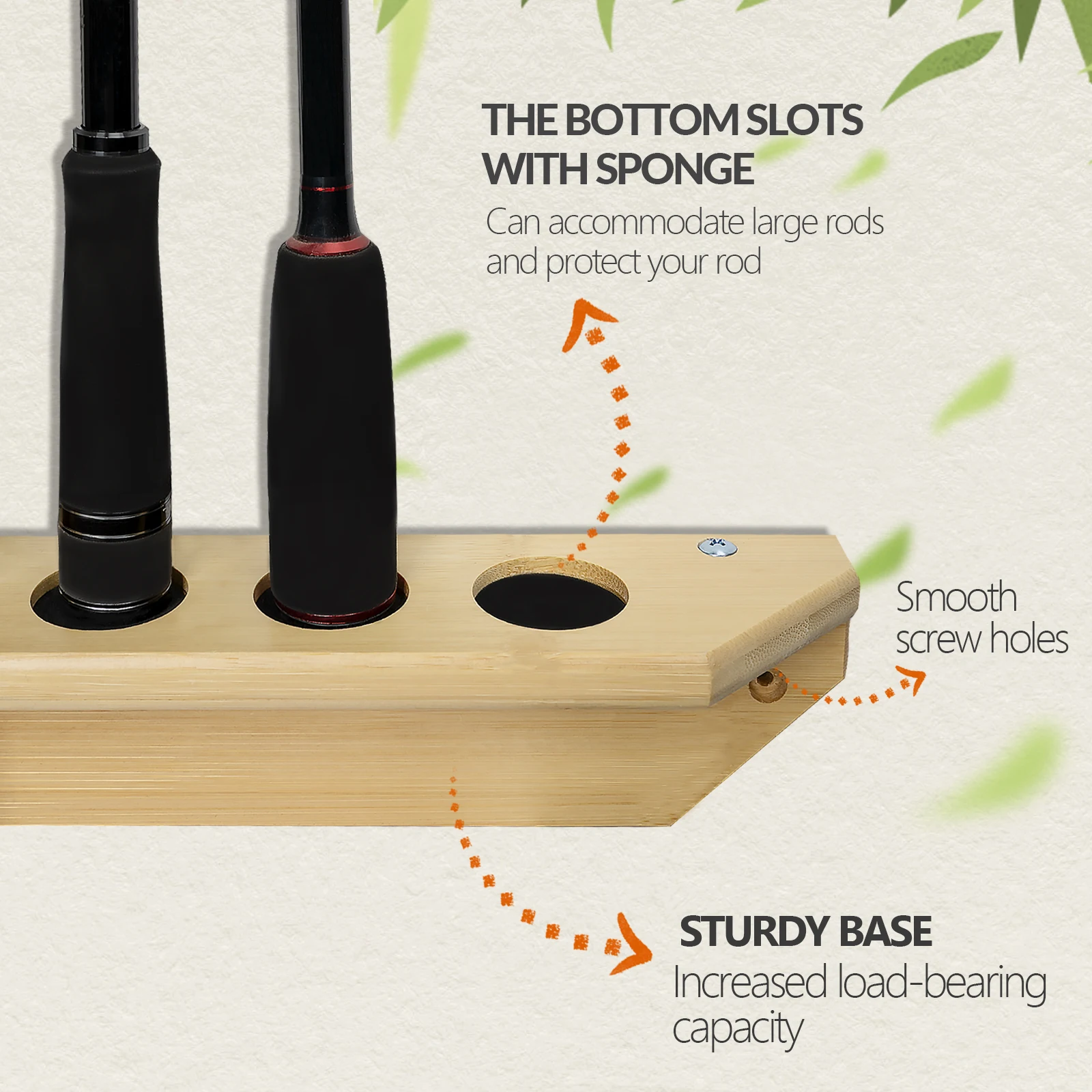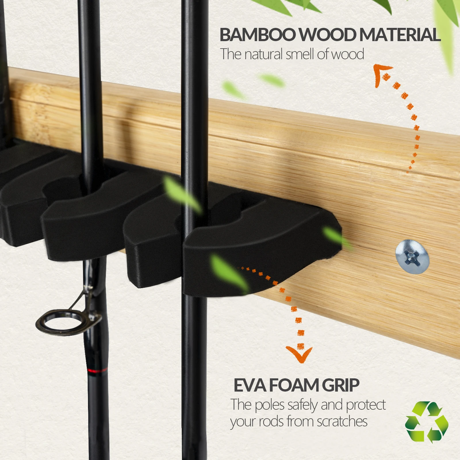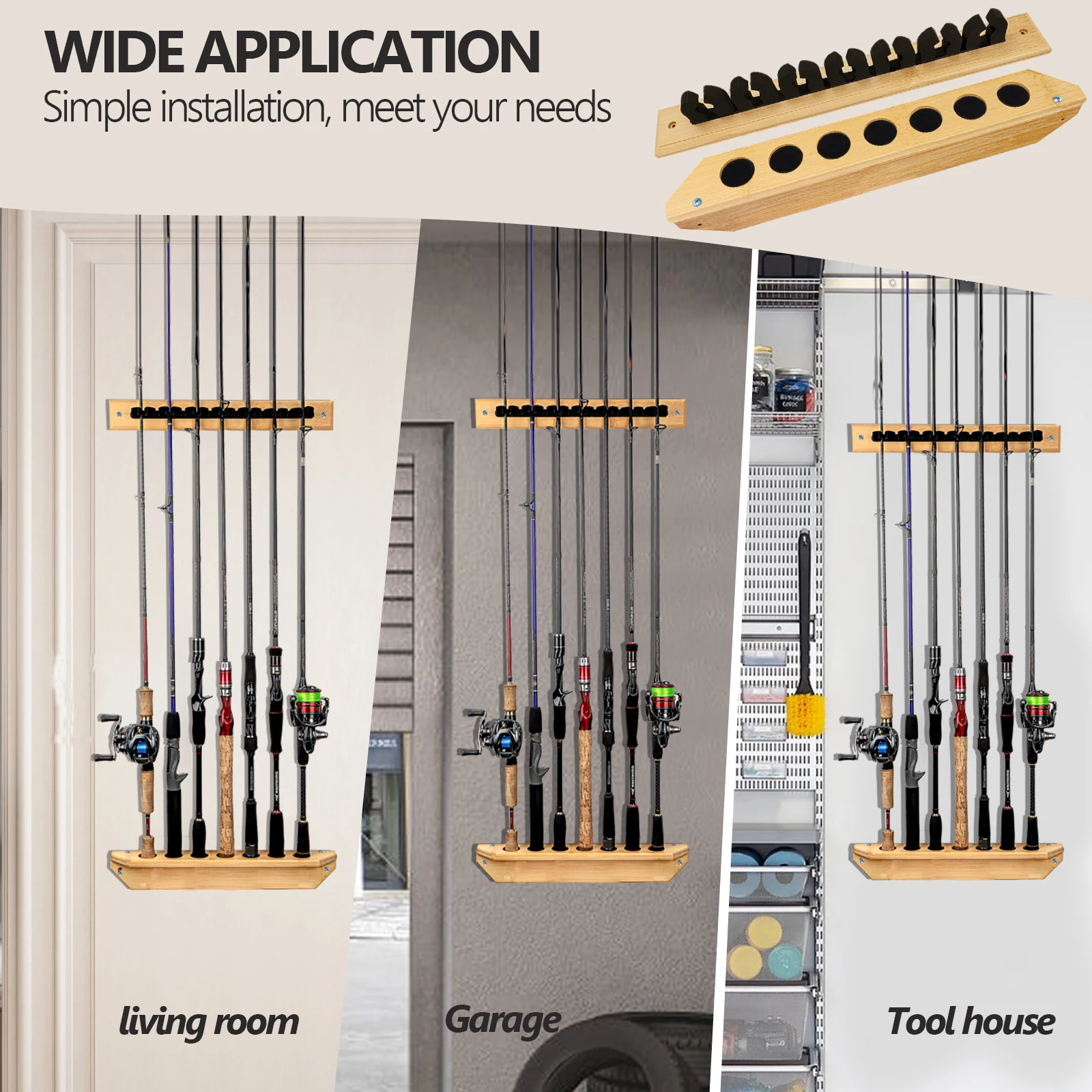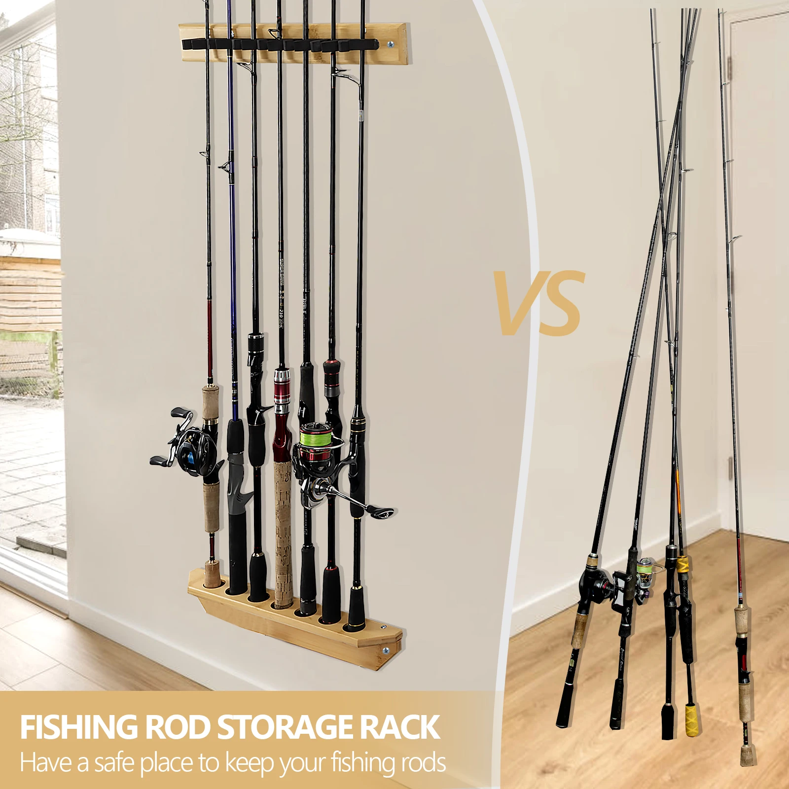 1. Hecho de madera maciza de primera calidad: hecho de madera maciza de bambú natural, nuestro soporte para cañas de pescar resuelve la mayor preocupación de los pescadores: ¡almacenar sus cañas de pescar de forma segura, cómoda, ordenada y sin daños!La superficie de la madera está finamente lijada y pintada para garantizar que las cañas de pescar se guarden de manera estable en el soporte para cañas de pescar; la veta natural de la madera añade un efecto decorativo a la habitación.