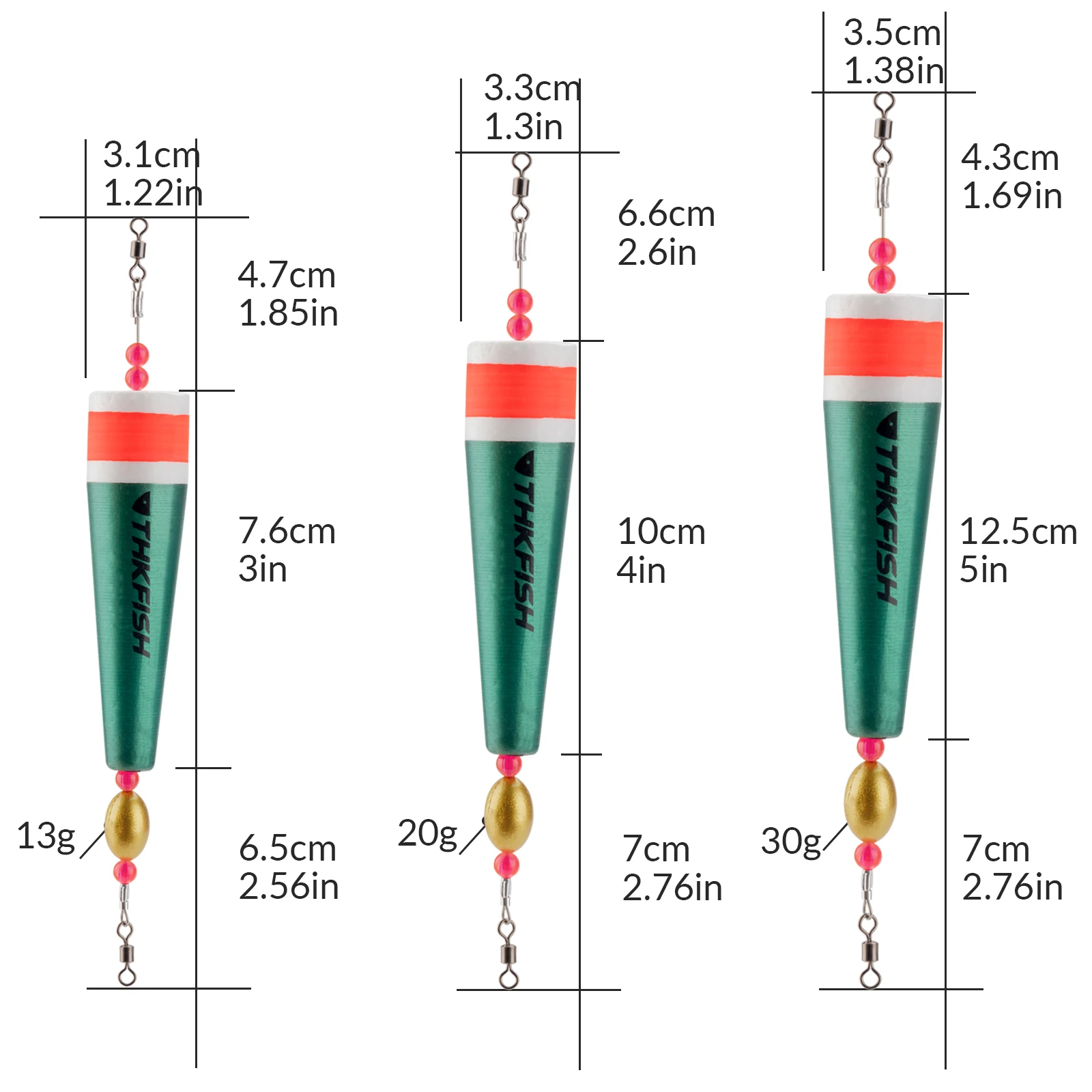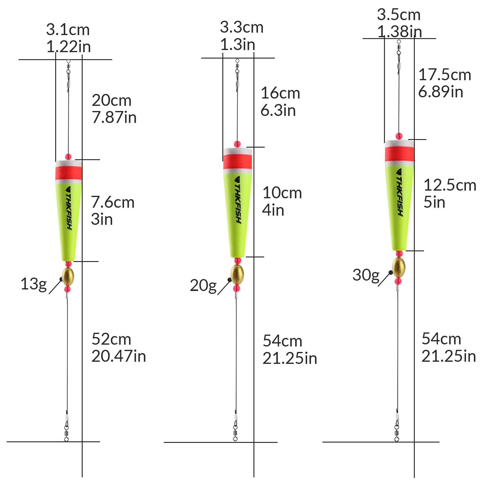 * Tamaño: flotadores de 3 pulgadas + plomo de 13 g, flotadores de 4 pulgadas + plomo de 20 g, flotadores de 5 pulgadas + plomo de 30 g