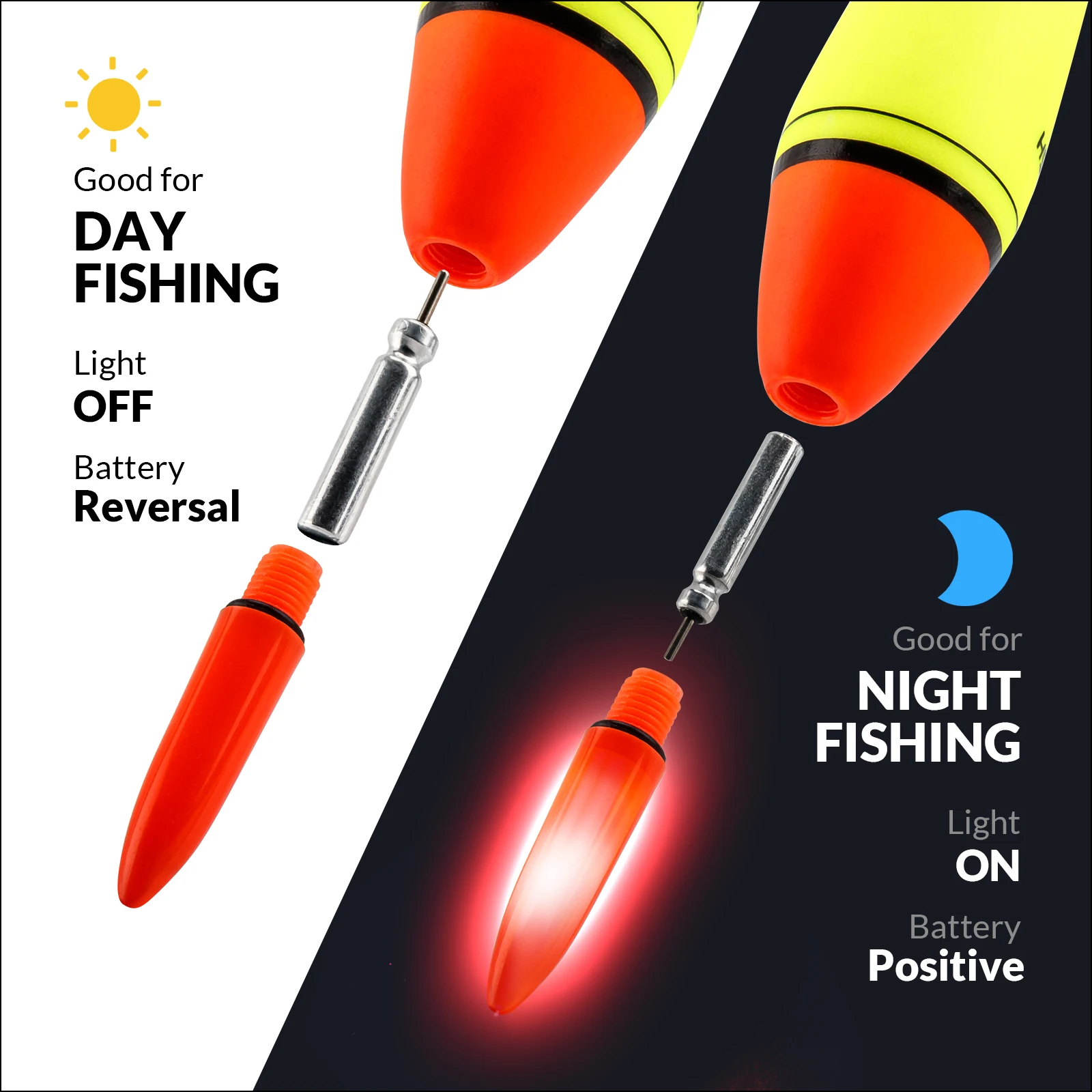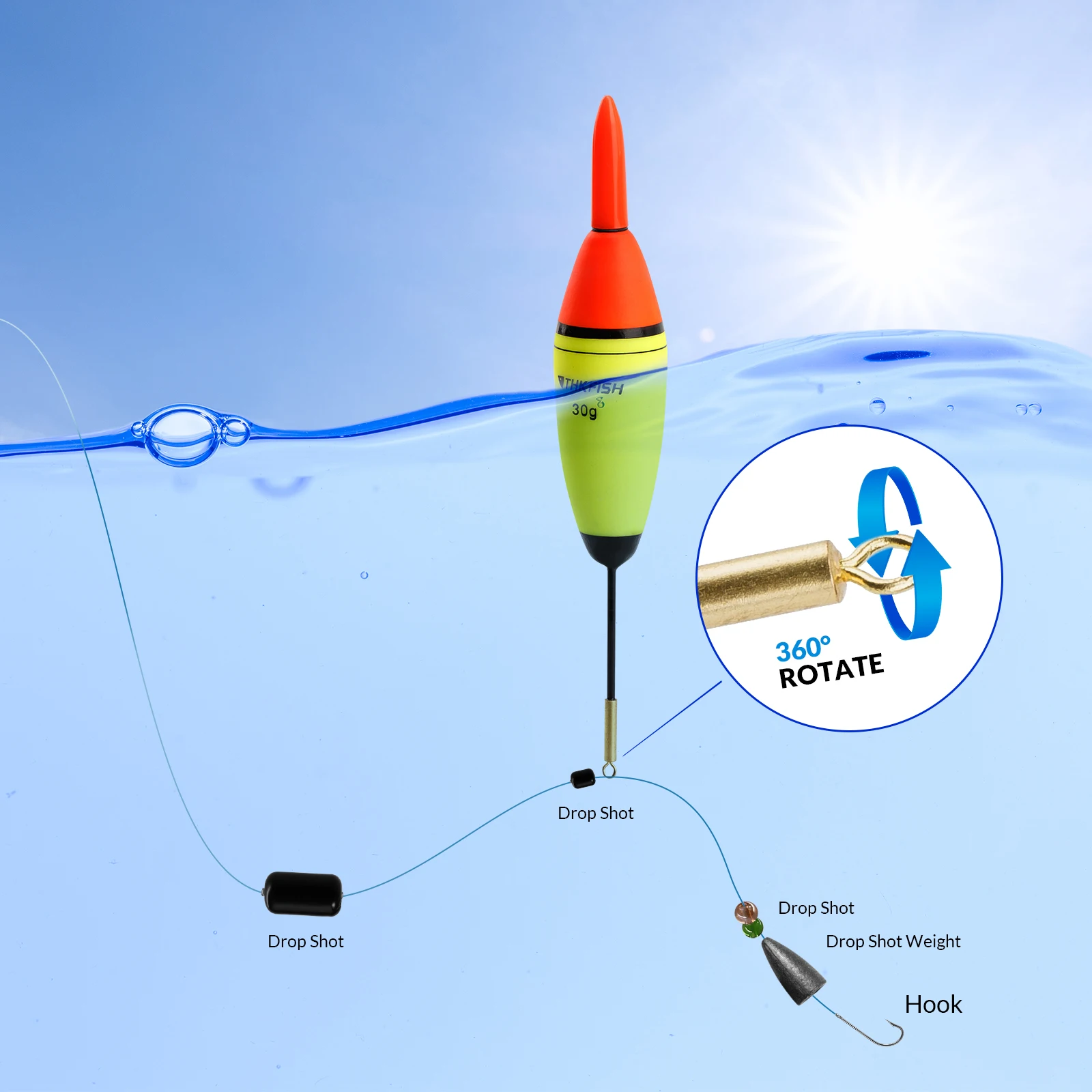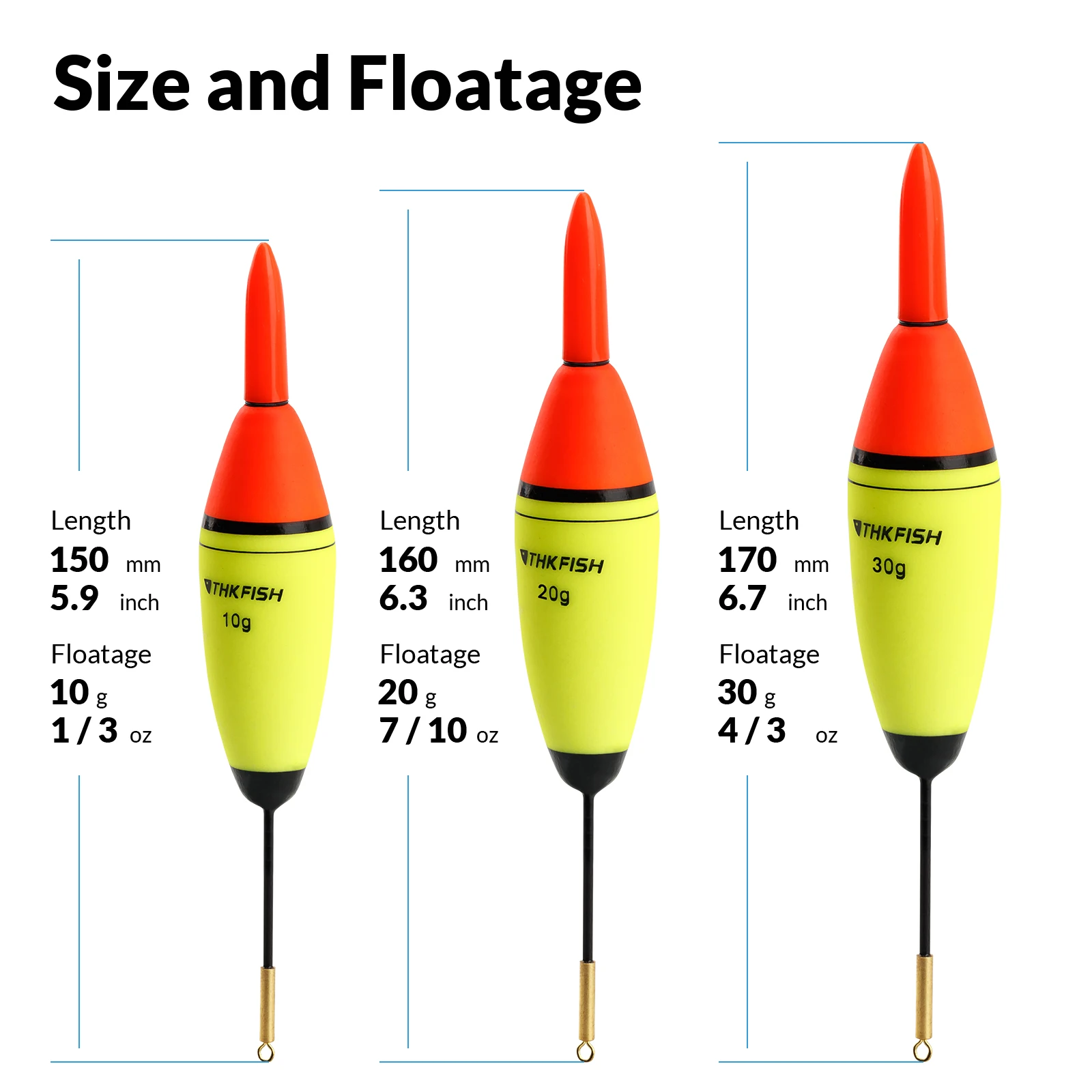 3.Flotador de pesca sensible: estos flotadores tienen un flotador grande, 3 flotabilidad a elegir: 10 g (3/8 oz), 20 g (3/4 oz), 30 g (1 oz).El flotador presenta un giro inferior de 360 grados, permite que el bobber gire 360 grados en el agua y mantenga la línea en la profundidad correcta.Funcionan muy bien como bobbers deslizantes.