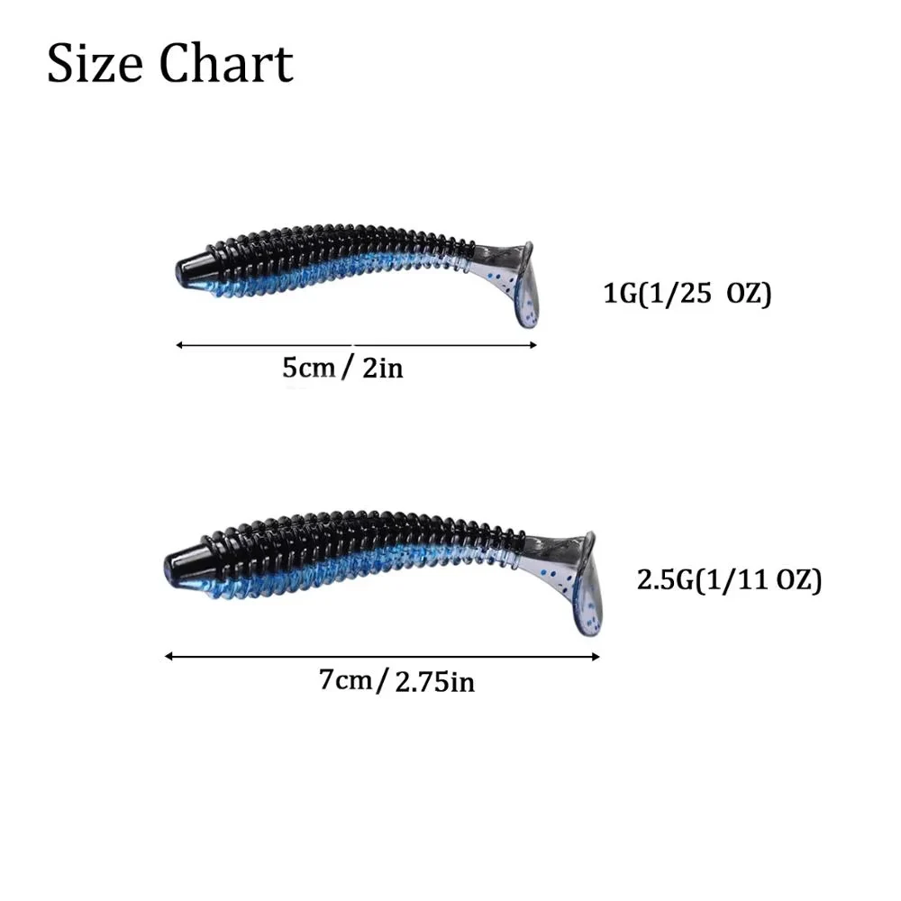 5. Diseño acanalado: las nervaduras profundas le permiten cargarlas con su aroma favorito para ese pequeño más si lo desea, y también ayudan a que la cola del señuelo se corra junto con la corriente para atraer al depredador más cercano.