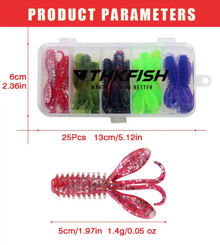 El paquete incluye: 25 señuelos blandos para camarones.