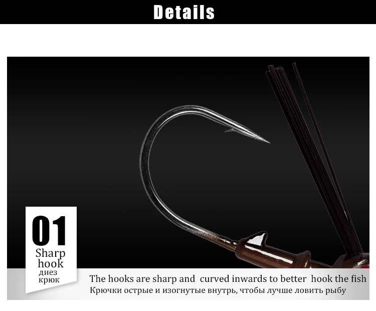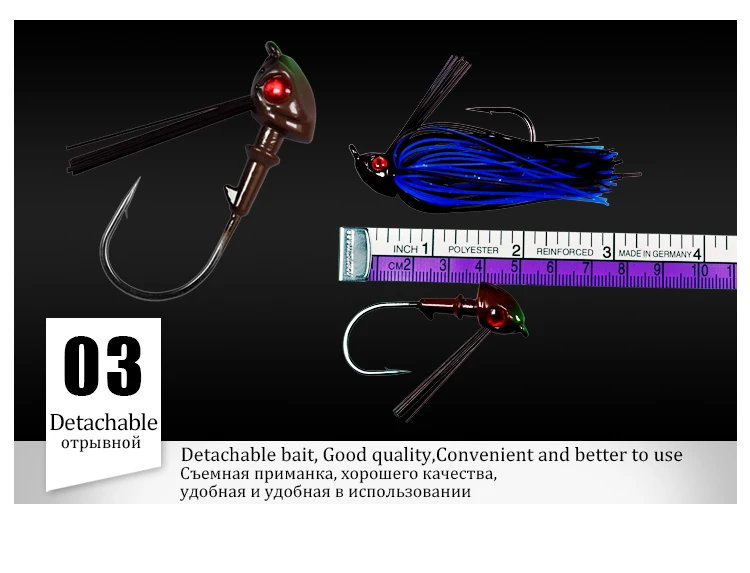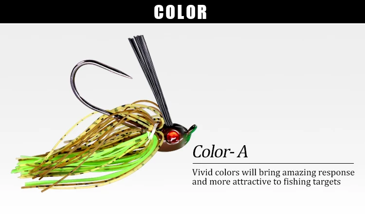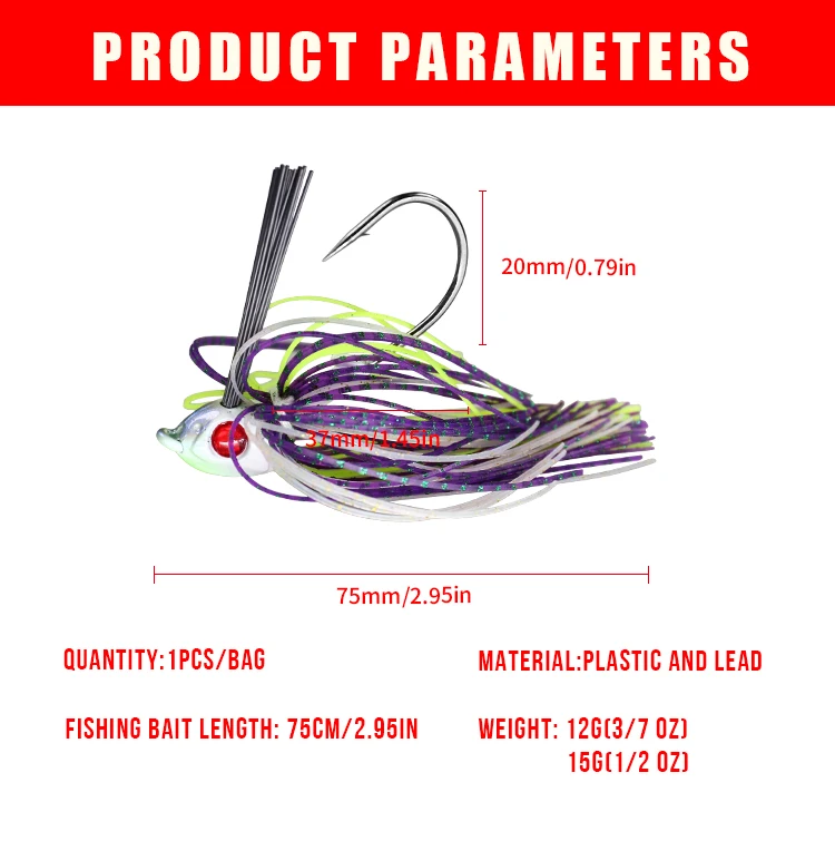 Peso seleccionable 12 g (3/7 oz) / 15 g (1/2 oz). Longitud de los ganchos: 3,7 cm/1,45 pulgadas (alrededor). Funcionaron muy bien para lagos de boca pequeña y lubinas de boca grande.