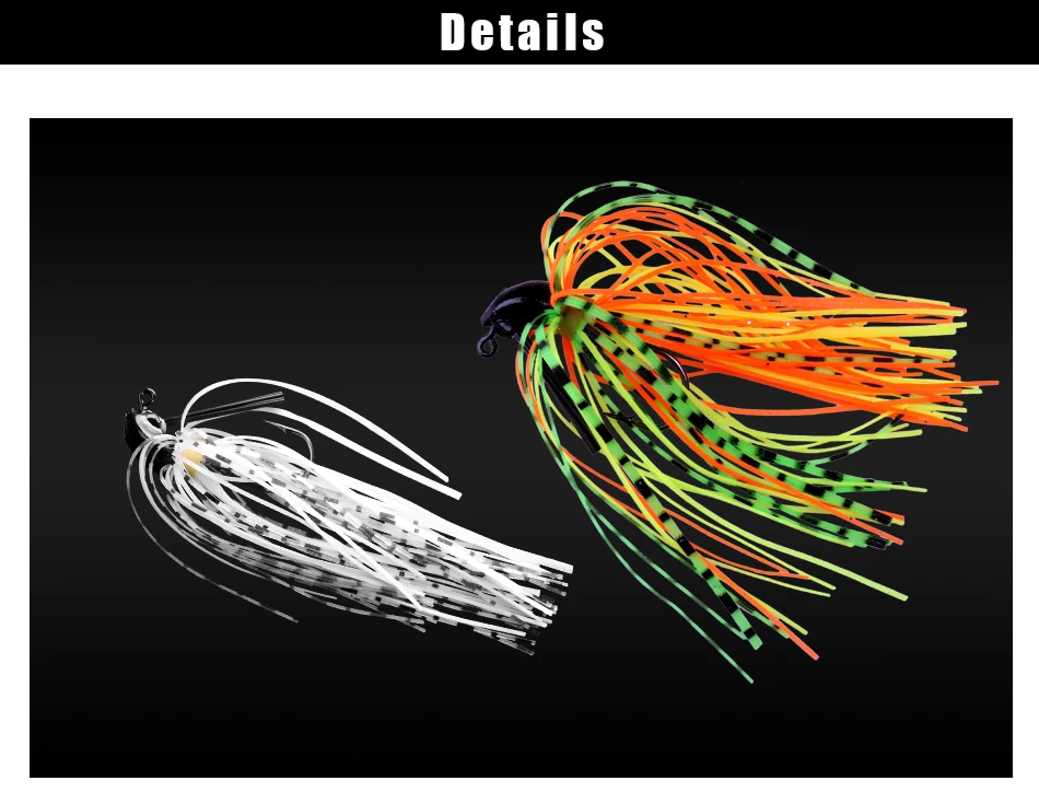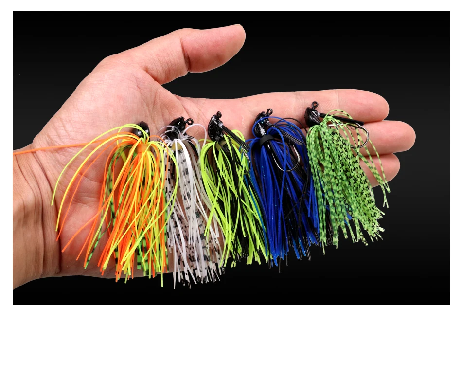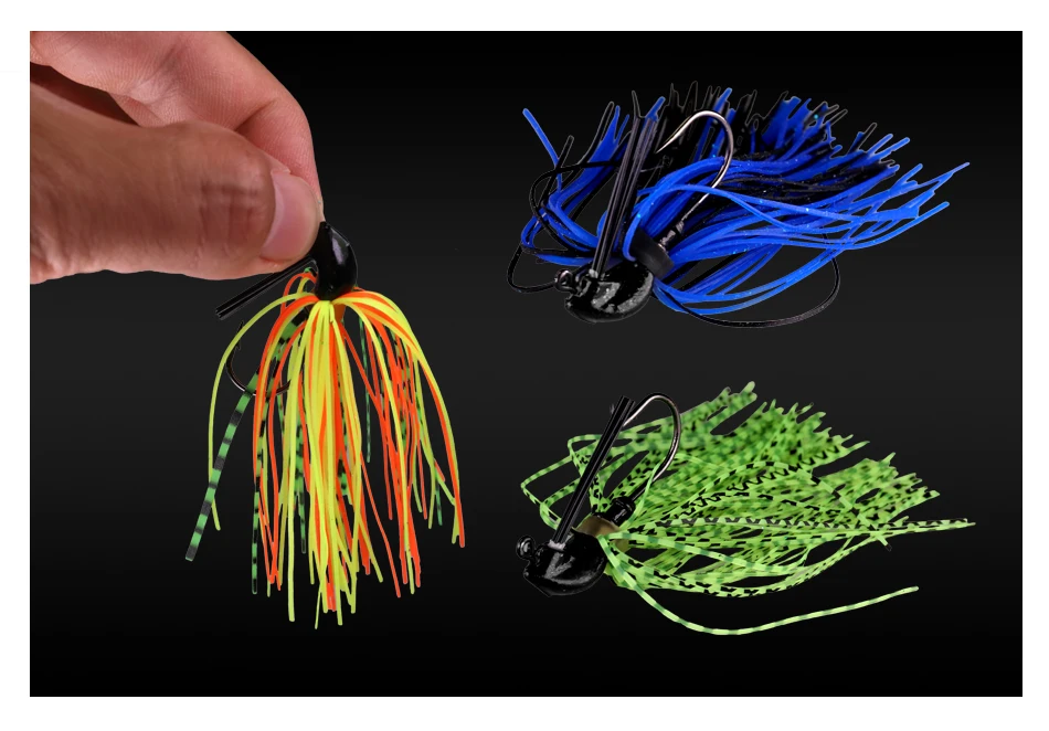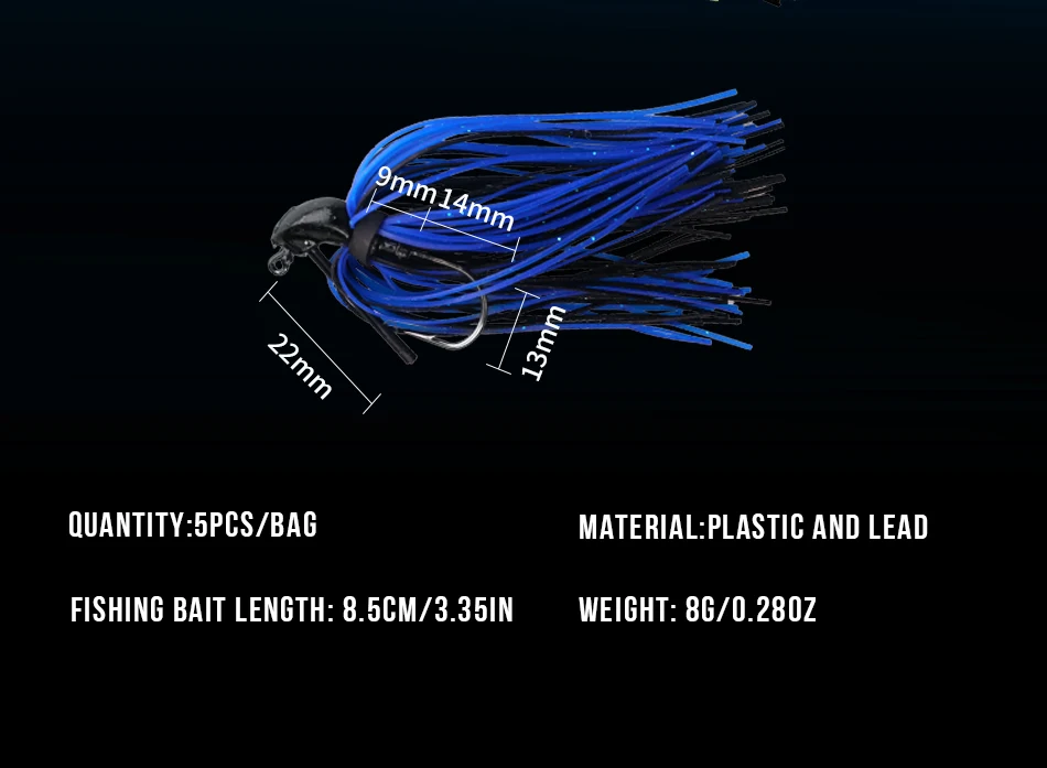 4. 7 g (1/4 oz), 10 g (3/8 oz), 14 g (1/2 oz). Longitud de los ganchos: 3,5 cm/1,37 pulgadas (alrededor). Funcionaron muy bien para lagos de boca pequeña y lubinas de boca grande.