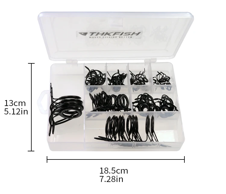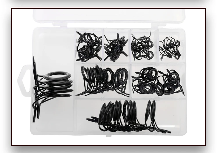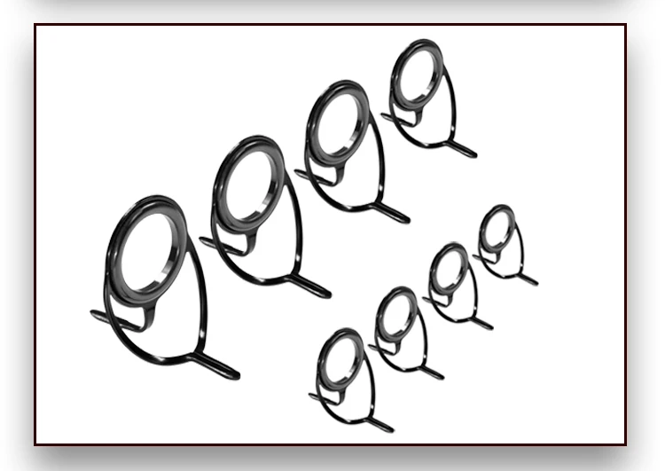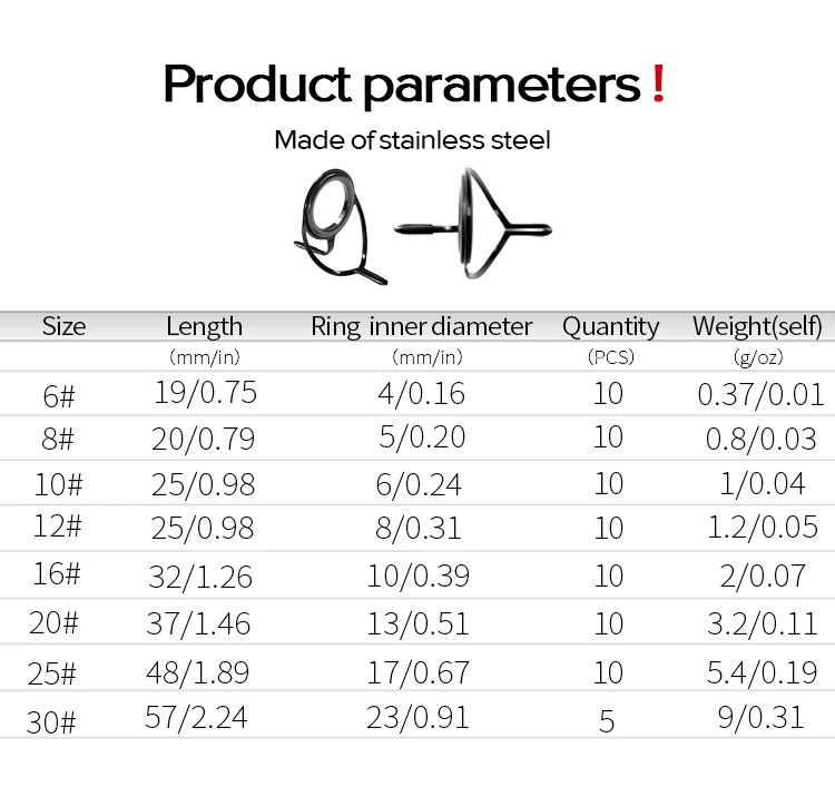 4.Guías de caña giratoria de varios tamaños: con una amplia gama de cañas para reparar, excelente kit para el pescador dedicado de varias especies.Diámetro interior de la guía: 6#*10 piezas (4 mm/0,14 pulgadas), 8#10 piezas (5 mm/0,2 pulgadas), 10#10 piezas (6 mm/0,24 pulgadas), 12#*10 piezas (8 mm/0,31 pulgadas), 16#*10 piezas (10 mm/0,4 pulgadas), 20#*10 piezas (13 mm/0,53 pulgadas), 25#*10 piezas (17 mm/0,67 pulgadas), 30#*5 piezas (23 mm/0,9 pulgadas).