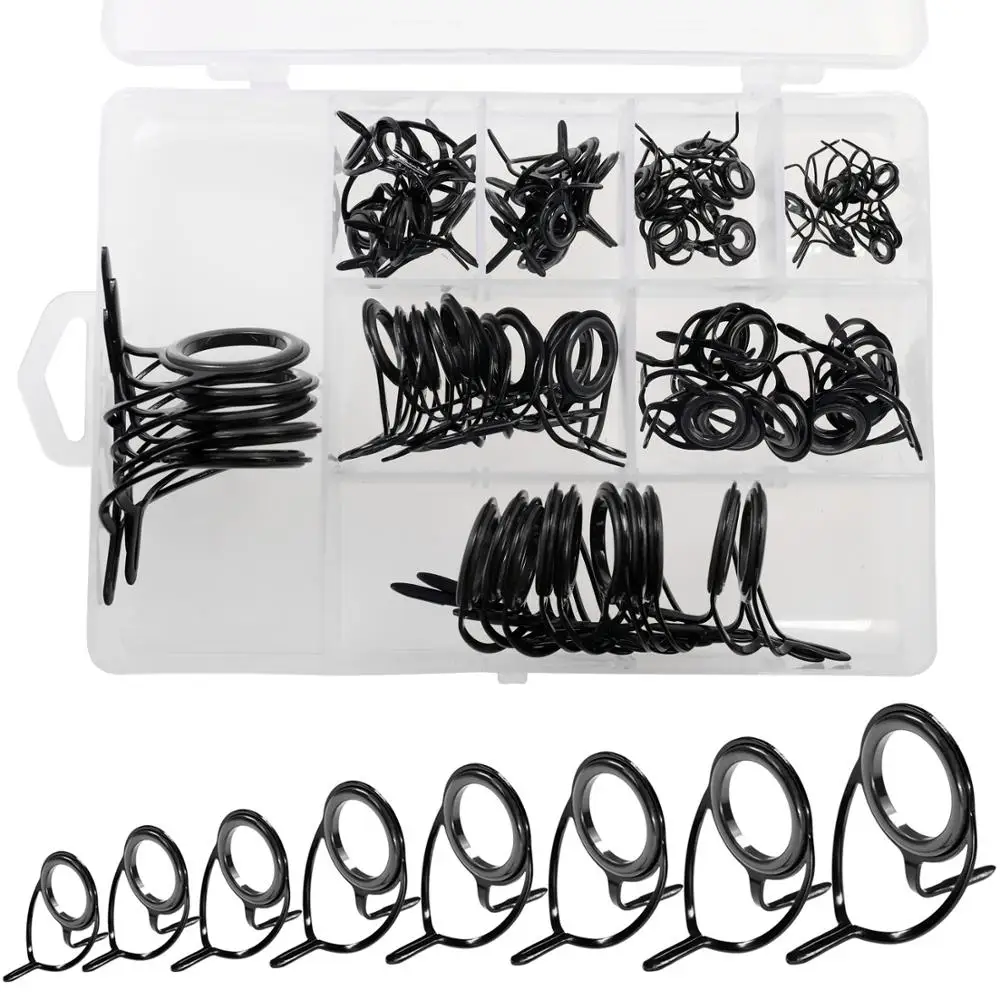 4.Guías de caña giratoria de varios tamaños: con una amplia gama de cañas para reparar, excelente kit para el pescador dedicado de varias especies.Diámetro interior de la guía: 6#*10 piezas (4 mm/0,14 pulgadas), 8#10 piezas (5 mm/0,2 pulgadas), 10#10 piezas (6 mm/0,24 pulgadas), 12#*10 piezas (8 mm/0,31 pulgadas), 16#*10 piezas (10 mm/0,4 pulgadas), 20#*10 piezas (13 mm/0,53 pulgadas), 25#*10 piezas (17 mm/0,67 pulgadas), 30#*5 piezas (23 mm/0,9 pulgadas).