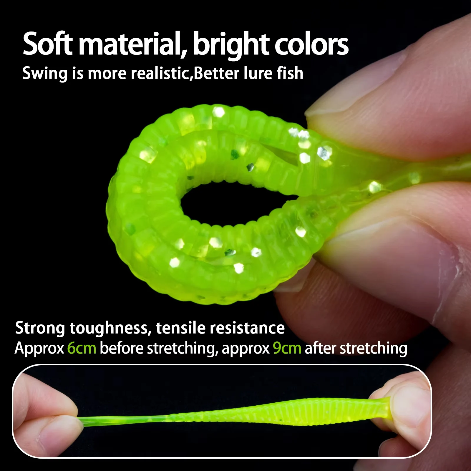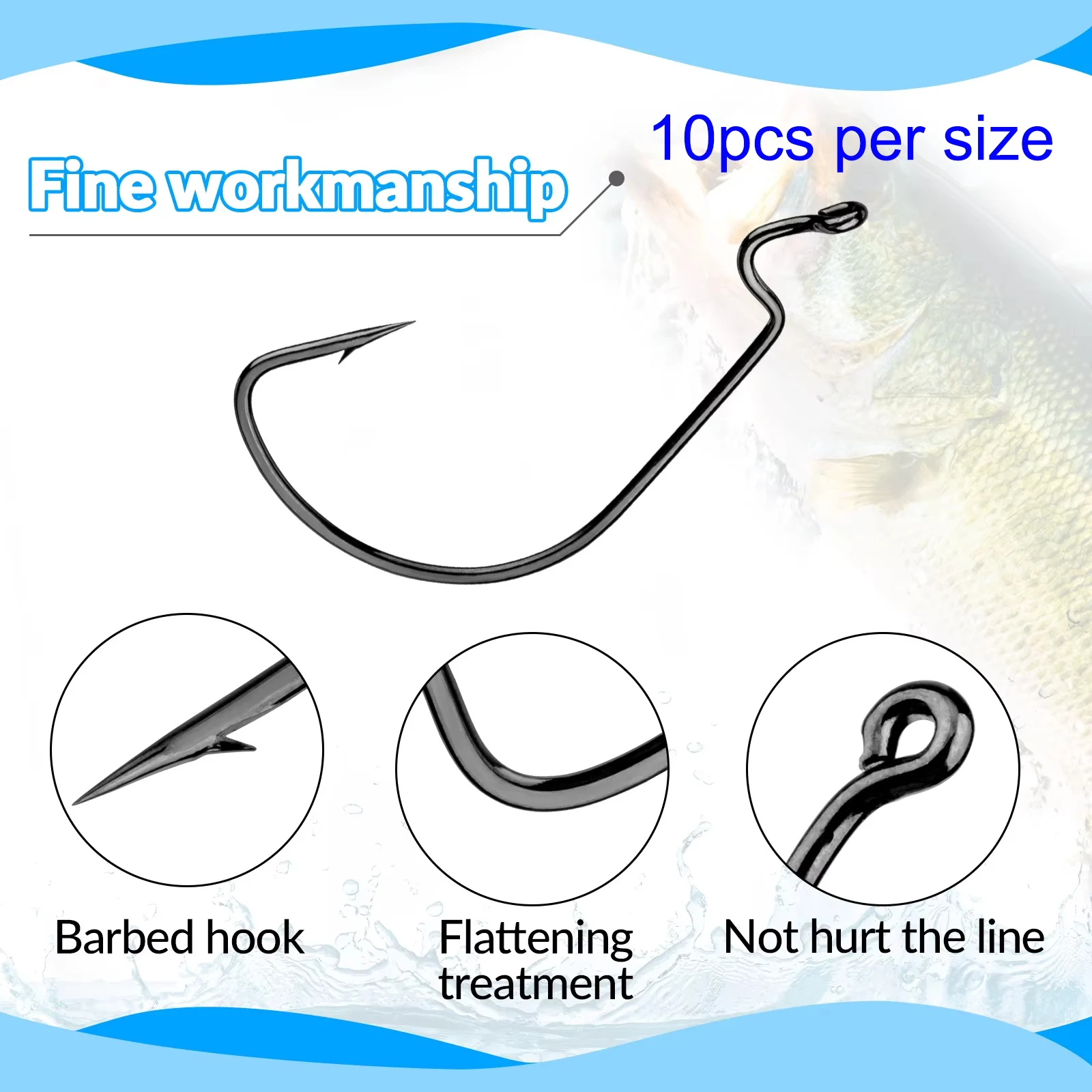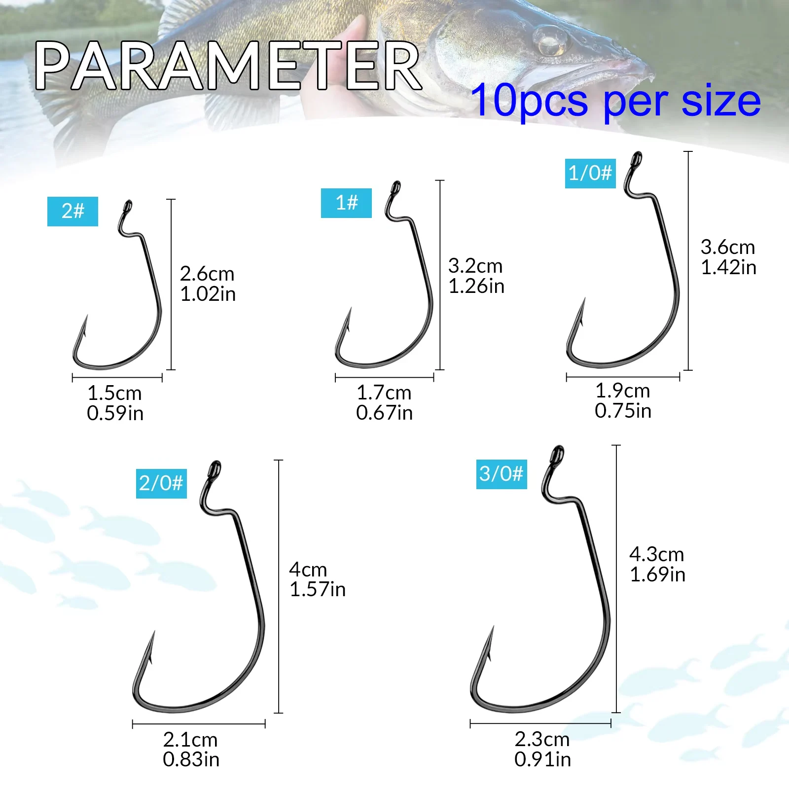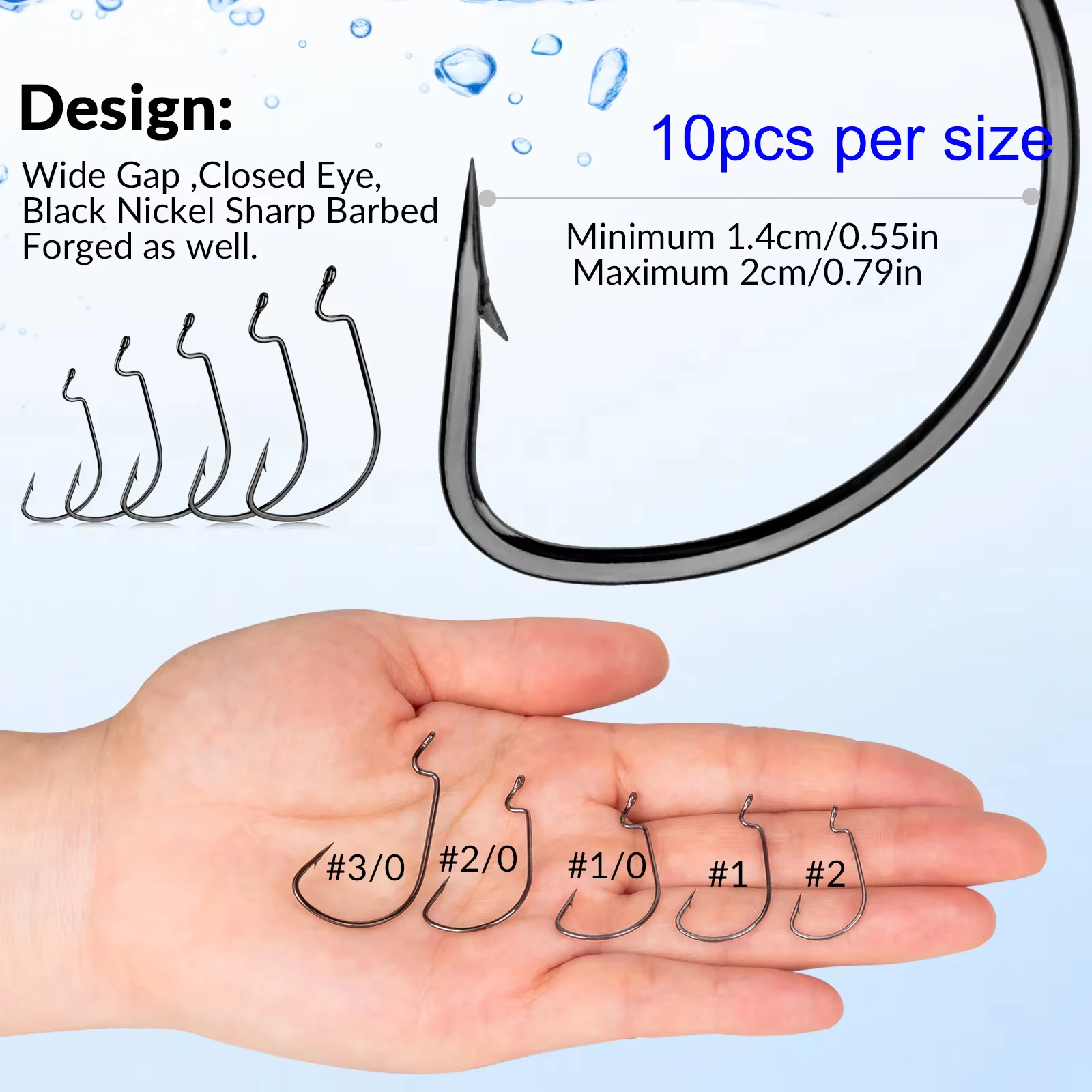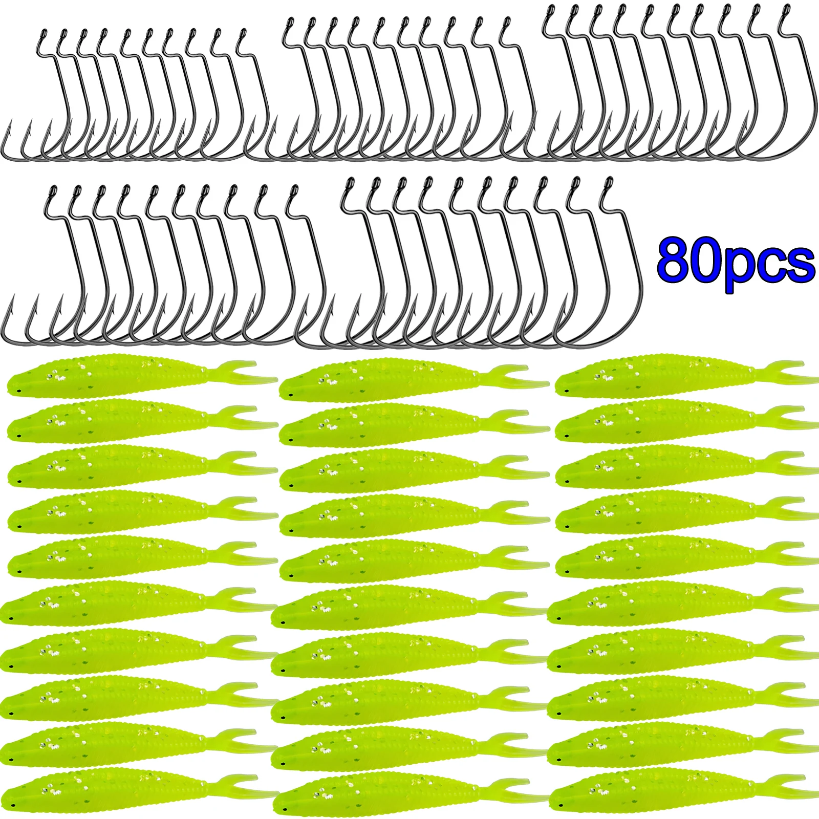 El paquete incluye: 30 señuelos blandos + 50 ganchos de tamaño mixto.