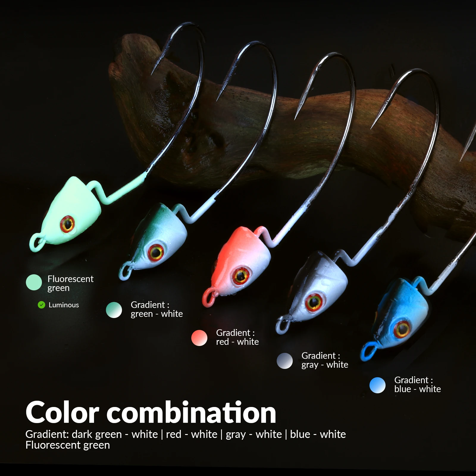 El paquete incluye: 5 anzuelos de pesca con cabeza de plantilla.