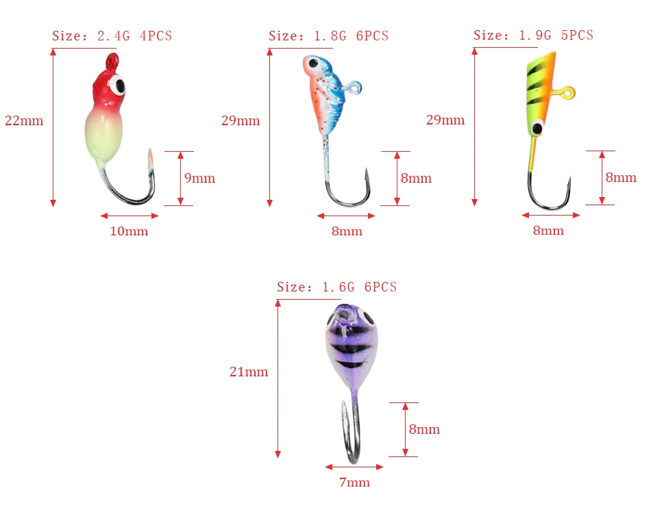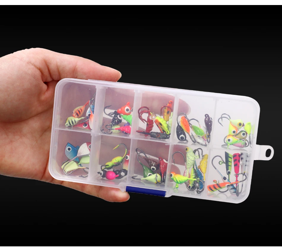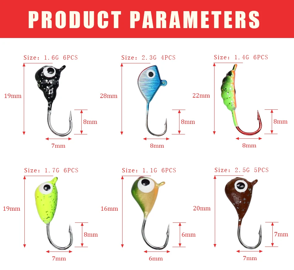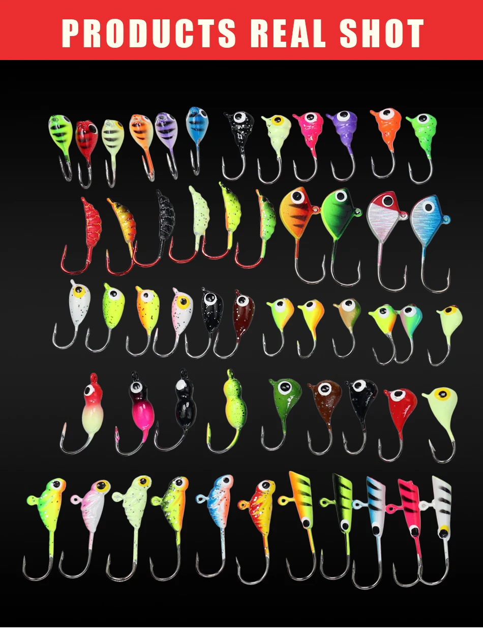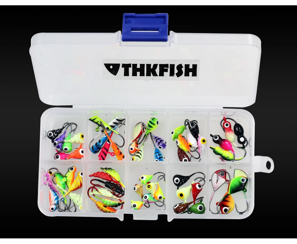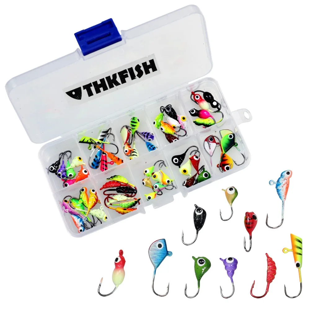 THKFISH-plantillas de pesca en hielo para invierno, Kit de señuelos, 1g-2,5g, Mini cebo duro de Metal, anzuelos de púas con cabeza de anzuelo para pesca de lubina, 54 Uds.