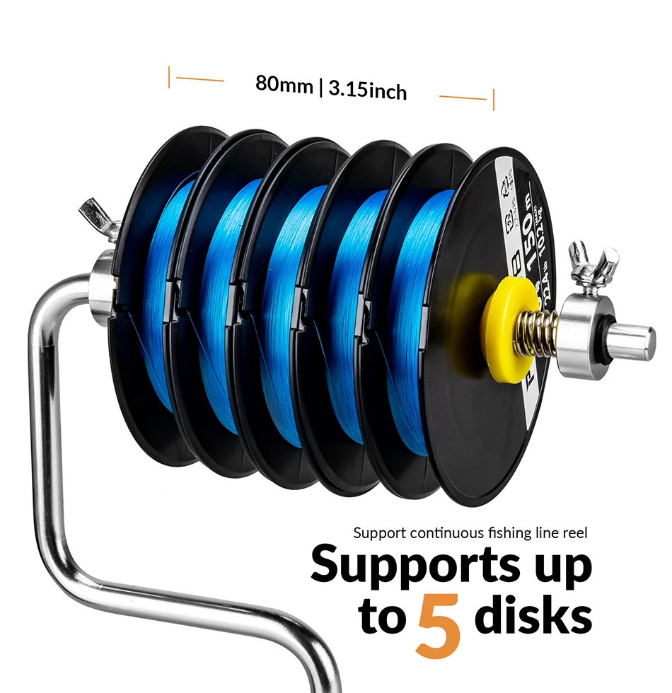 COMPATIBLE con varios carretes: El carrete de sedal funciona con sedal trenzado, Sedal flurocarbon y sedal monofilamento. Capaz de sostener varios carretes al mismo tiempo. El diámetro de la varilla del eje de resorte es de 0,31 pulgadas (8mm), y los carretes de línea de menos de 0,31 pulgadas (8mm) no pasarán. El máximo de carrete ancho es de 3 15in/80mm Facilidad de uso para manejar cualquier tipo de línea y/o carrete.