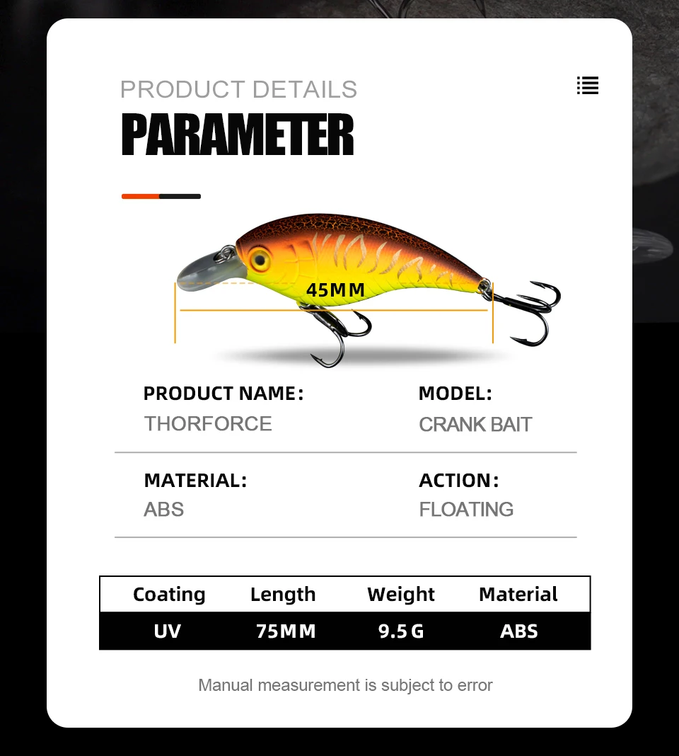 THORFORCE 75MM 9,5G pesca Wobbler flotante Crankbait Pike Bass cebo duro Artificial trucha Topwater señuelo de pesca aparejos